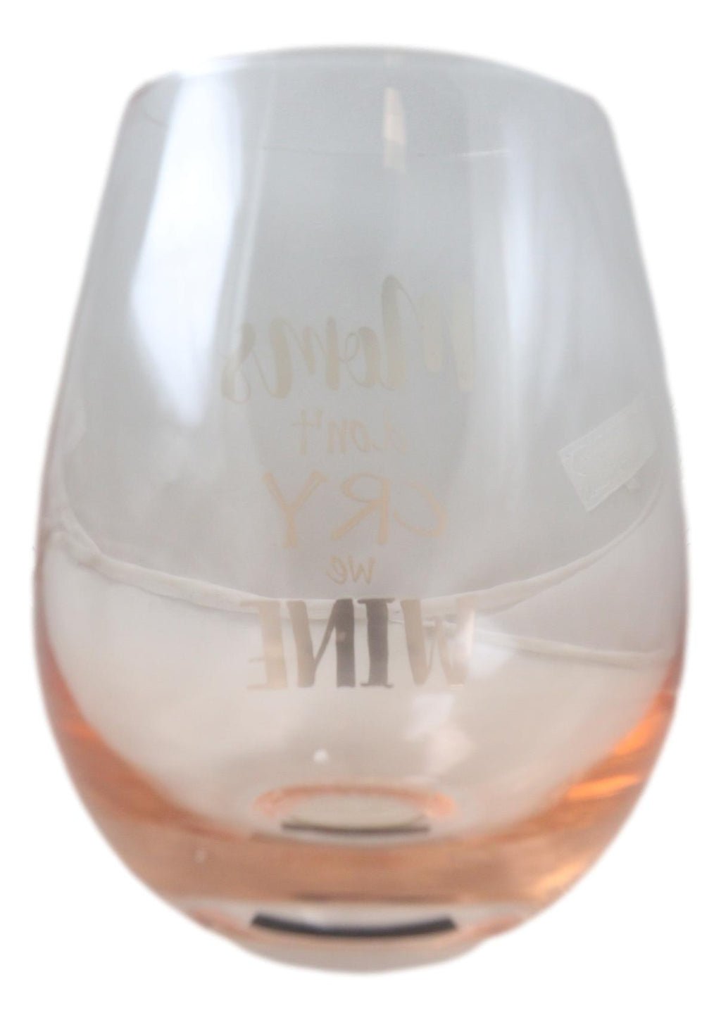 • Add a touch of humor to your beverage sipping by drinking from this playful stemless glass sporting a hilarious phrase 'Moms Don't Cry We Wine'. The letters are emblazoned in gold metallic finish while the base of the glass is tinted in rose gold color.