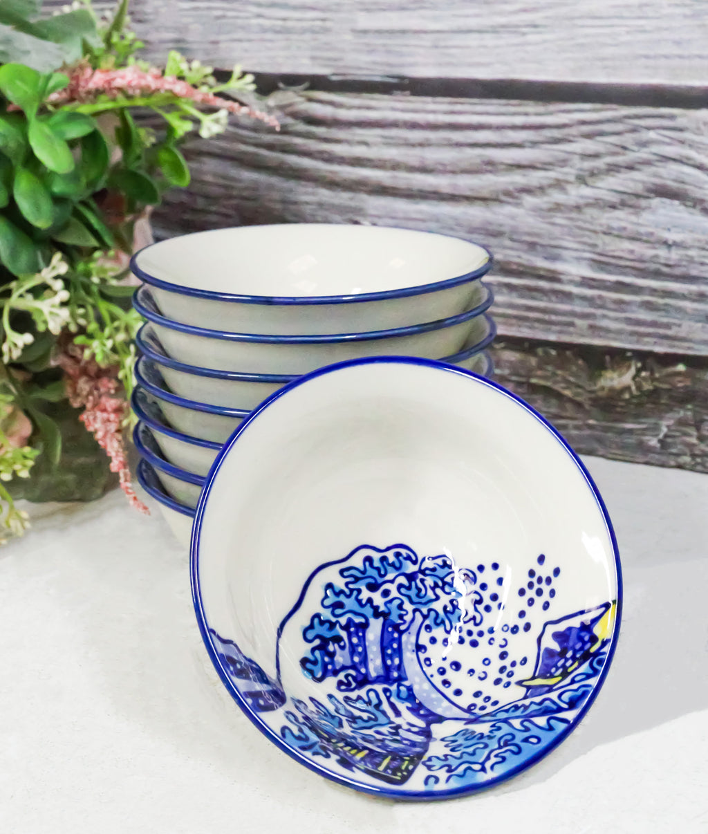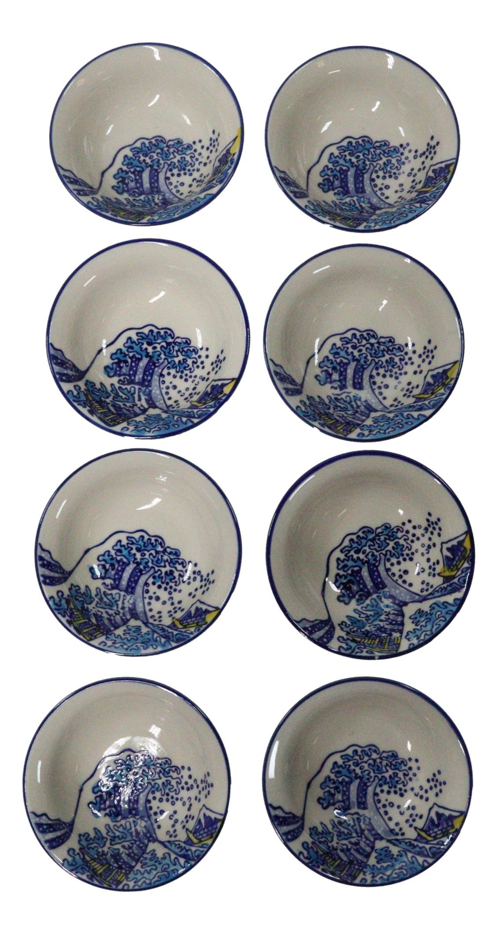 • These beautiful sauce dishes are made of ceramic porcelain. Our traditionally crafted pottery are made of the highest quality ceramic available and fired at a high temperature to maximize the strength of the ceramic, making them superior to other ceramics in the market. Our pottery are more resistant to cracks, stains, and scratches. Our ceramic is food safe and contain no lead or cadmium. • These beautiful sauce dishes each measures 1.5" High and 3.75" in Diameter approximately. Each plate weighs about 3 ounces. They are microwave and dishwasher safe. • The Great Wave off Kanagawa is one of the most iconic works of Japanese art, created by the famous ukiyo-e artist Katsushika Hokusai around 1831. Part of his series Thirty-Six Views of Mount Fuji, this woodblock print depicts a powerful, towering wave threatening to engulf three small boats, with Mount Fuji visible in the background. The wave's dynamic curves and the contrasting calm of Mount Fuji symbolize the sublime and uncontrollable forces of nature. • These sauce dishes can store efficiently in a small space and can easily be placed it on your chicken plates, not like others large bowls. Compact contemporary design perfect for serving chip dips, ketchup, soy, appetizer and chocolate syrup, fried shrimp paste or even as individual oil dip.