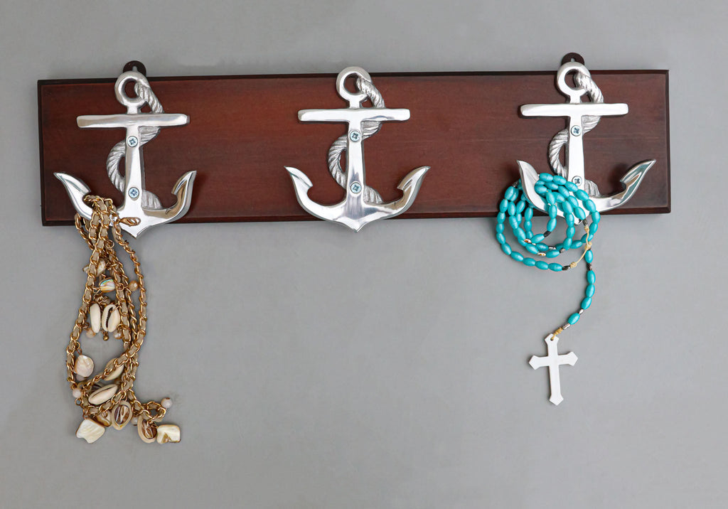 • This sailor ship anchors multi pegs wall hook on board is made of aluminum and wood, polished and finished in nickel color.