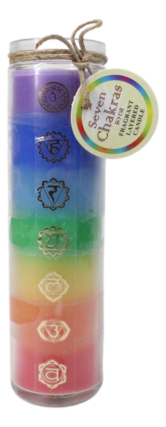 • This Tall Tube Candle is made of paraffin wax in various scents. • Approximate Burn Time 50 hours. Please practice caution when burning and never leave lit candle unattended. • Candle Dimensions: 8.25" high and 2.25" diameter. It weighs about 1.5 pounds. Made in India. • Tall tube candle with different colored wax for each of the seven different chakras. The candle is presented in a tall glass holder with each chakra symbol over the relevant color of wax. This candle would make a lovely gift for someone who enjoys yoga or reiki to help enhance their spiritual and physical wellbeing • Props in photos are not included with the item.