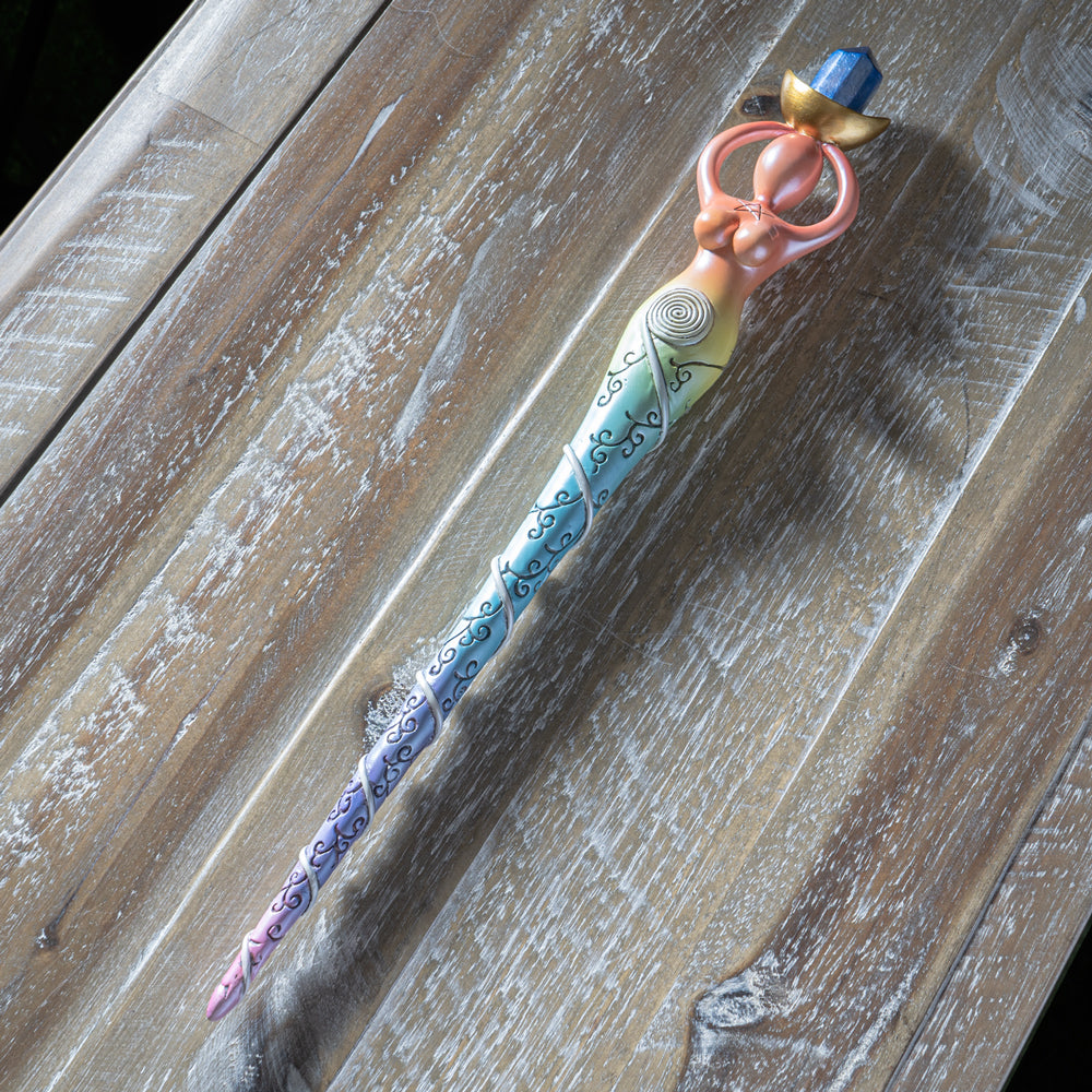 • This Chakra Spiral Goddess Magic Wand is made of designer composite resin, hand painted and polished individually. Although it is made of hardened composite resin, this wand is not recommended for children under 9 years old as care is needed during use to prevent breakage/damage.