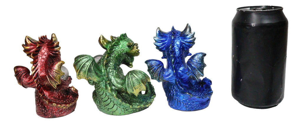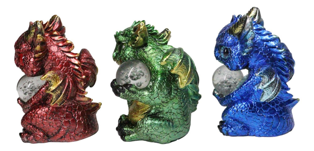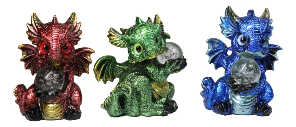 • These Whimsical Baby Dragon figurines are made of polyresin, hand painted and polished individually. • These Whimsical Baby Dragon figurines each measures approximately 4.25" tall, 4" long and 3.5" deep each. • Add a burst of magical color to your collection with these colorful Baby Dragon Hatchlings Holding Glass Orbs Figurines. This enchanting trio features adorable dragon hatchlings in vibrant metallic hues, each clutching a shimmering glass orb that catches the light beautifully. With intricate detailing and a glossy finish, these figurines embody the charm and wonder of mythical fantasy. • This listing comes as a pack of 3 dragons.