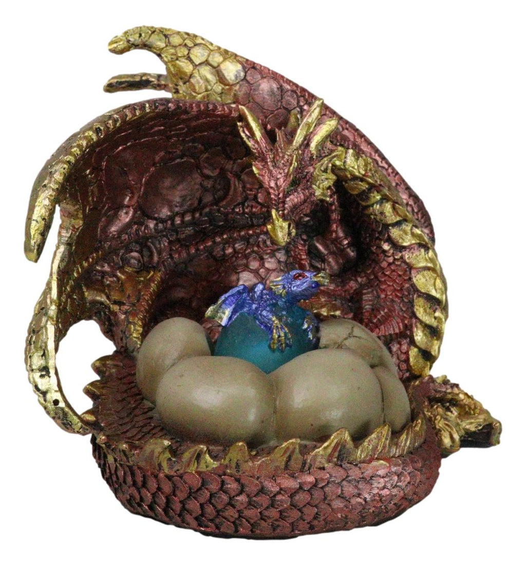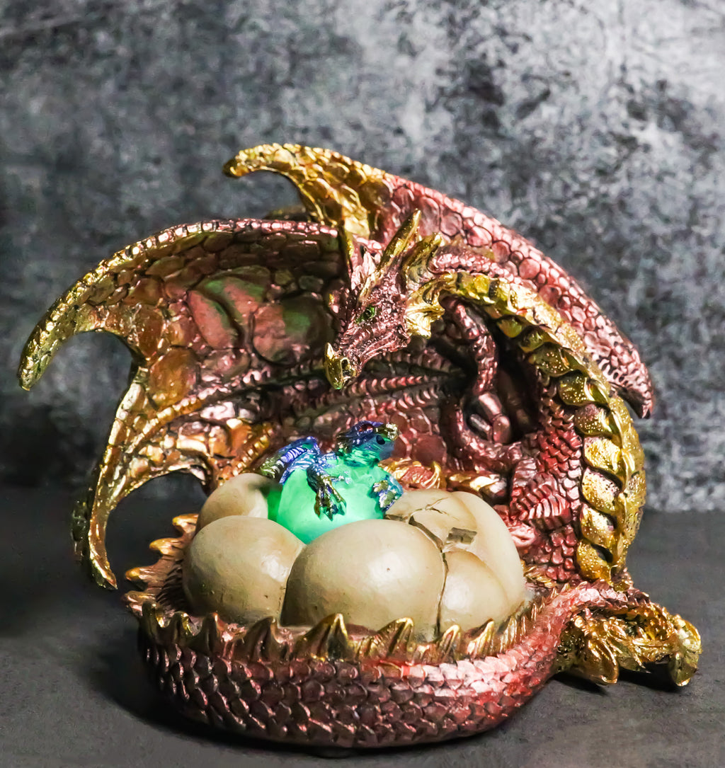• This Metallic Dragon Family Figurine stands at 5.25" tall, 6.25" long and 5" deep approximately. It weighs about 1.25 pounds. • This Metallic Dragon Family Figurine is made of designer composite resin, hand painted and polished individually. • This unique figurine features a powerful mother dragon with a vibrant metallic red body, adorned with streaks of gold, giving her a fiery and majestic appearance. Nestled close by, a baby dragon is emerging from its LED light up egg, ready to explore the world under her protective gaze. Surrounding the hatchling are its siblings, still tucked inside their eggshells. Ideal for fans of dragons, fantasy themes, or as unique decor.