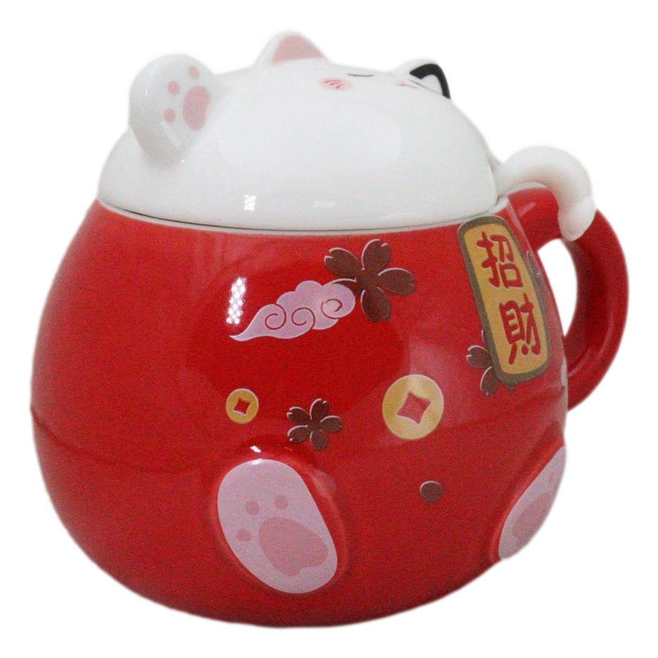 • This Maneki Neko Cat mug is made of high quality ceramic porcelain and stainless steel (spoon). CA Prop 65 Compliant. Color Tone May vary from pictures. • This Whimsical Animal Mug With Lid measures 4.25" tall, 6" long and 4.5" in diameter. Mug has 15oz capacity. Microwave and Dishwasher safe. • Looking for a cute collectible mug for your office or home? This maneki neko mug or lucky cat mug is both adorable and functional! It comes with a lid and a convenient stirrign spoon. • The maneki-neko is a common Japanese figurine often believed to bring good luck to the owner. It is also translated as "beckoning cat". • Props in photos are not included with the mug. This listing selection is for a Red colored Maneki Neko mug.