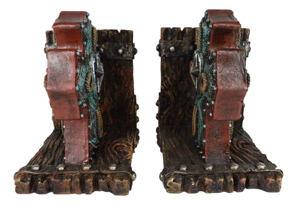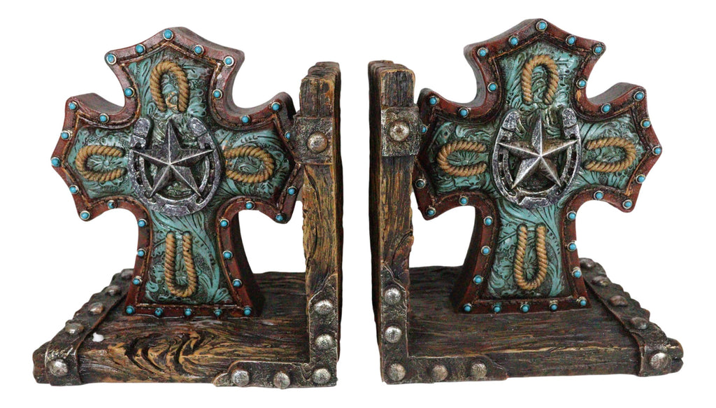• These Western Star Turquoise Horseshoes Cross Bookends Set is made of polyresin, hand painted and polished individually. • These Western Star Turquoise Horseshoes Cross Bookends Set each measures 6.25" High, 6.25" Wide and 5" Deep approximately. They weigh about 2.5 pounds. • A pair of truly stylish and inspirational cross shaped bookends will grace your room with a western flair. Starting with an L-shaped faux heirloom wood planks as the base, each bookend features Triquetra point ends that are bordered by faux tooled leather stitching and turquoise button heads. The cross is decorated with horseshoes and a large western star at the center. • Props and Books in photos are not included with the listing.