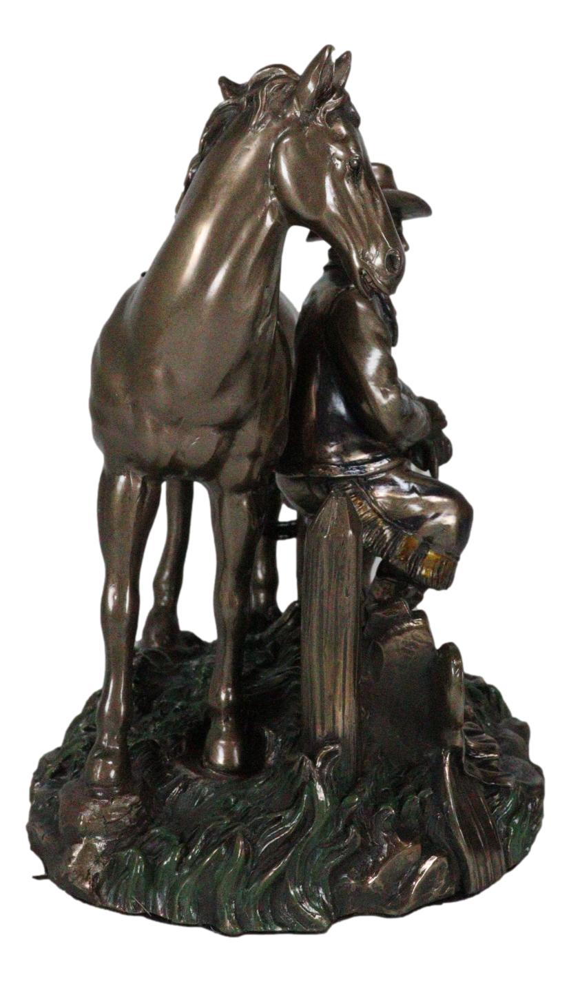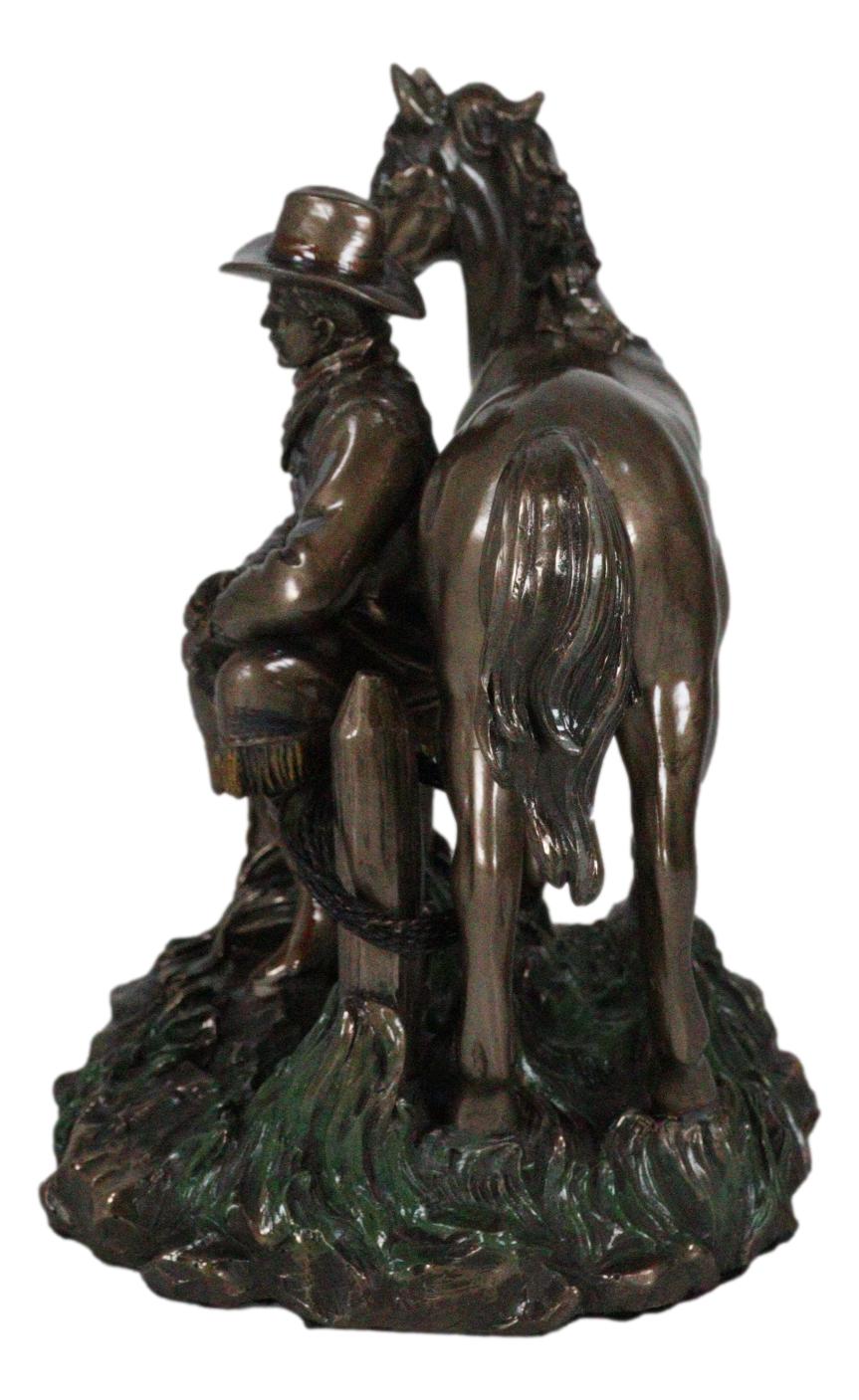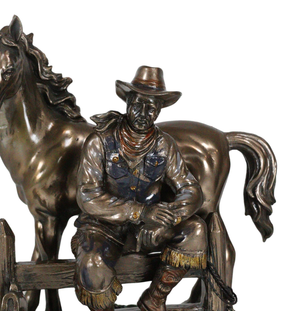 • This Desert Tranquility Cowboy With Horse Figurine is a dramatic work of sculptural art that is a true statement piece for your home gallery, paying homage to the larger-than-life characters of the Old West. It features a cowboy sitting on a fence by his faithful steed horse, enjoying the peace and tranquility of the old world. Finished in faux bronze color, the sculpture will add rustic charm to any room you set him in.