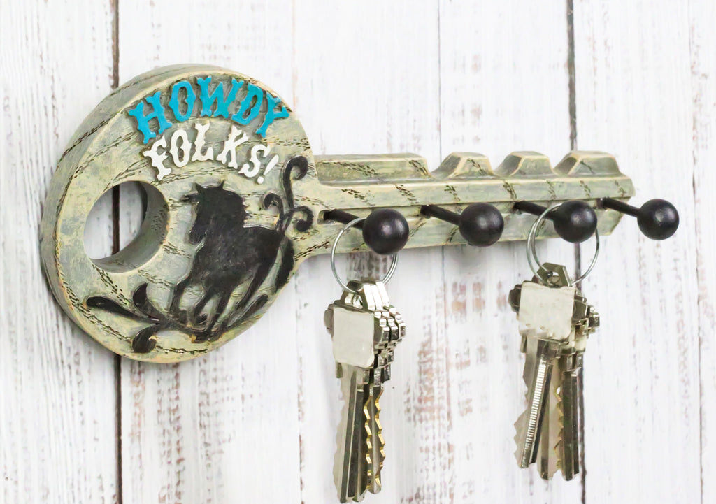 • This Key Shaped Howdy Folks Wall Hanging Quadruple Hooks Accent is approximately 3" tall, 7.75" wide and 1.75" deep approximately. It is recommended to anchor your drywall prior to hanging this item. Hanging hardware not included. • This Key Shaped Howdy Folks Wall Hanging Quadruple Hooks Accent is made of resin and metal, hand painted and polished individually. Color Tone may vary slightly from pictures. • Greet your space with a touch of Western charm using our Western "Howdy Folks" Horse Silhouette Key-Shaped Faux Wooden 4 Peg Quadruple Wall Hook. This distinctive wall hook blends practicality with rustic aesthetics, featuring a key-shaped design adorned with a horse silhouette and the warm appeal of faux wood. The four sturdy pegs provide an ideal solution for organizing keys, hats, or accessories while adding a dash of cowboy spirit to your entryway or living space. • Soda can placed next to the sculpture are not included with the listing. It is meant to provide size perspective of the item.
