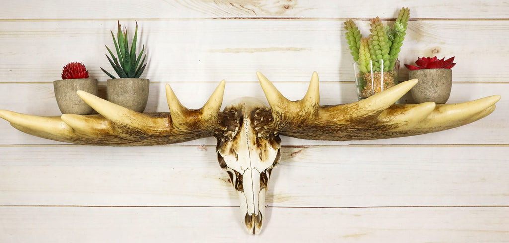 • This Moose With Antlers Wall Rack Shelf is approximately 8" tall and 27.5" long and 11" deep. It is designed to hang on the wall. The wall shelf sculpture weighs about 4 pounds. It is recommended to anchor your walls prior to hanging this wall shelf. Hanging hardware not included. • This Moose With Antlers Wall Rack Shelf is made of polyresin and fiberglass mixture, hand painted and polished individually. • Get the finest in antler decor with Ebros Gift collection of faux and shed antler items. Our wide selection of antler art, antler furniture, antler accent and more will bring an elegant touch of the wild to your home. Avid sportsmen and casual nature lovers alike will find something to love in our wide collection of antler decor, accessories, artwork, and gifts. Our selections of faux antler reproductions make it easy to give your home an air of wilderness mystique. • This moose skull antlers floating wall shelf is a multi use accent for your room. It functions not only as a shelf, but also as point hooks to hang light duty personal items or kitchen accessories. The possibilities are endless with this rustic faux antlers home decor organizer sculpture. • Props in photos are not included with the wall shelf.