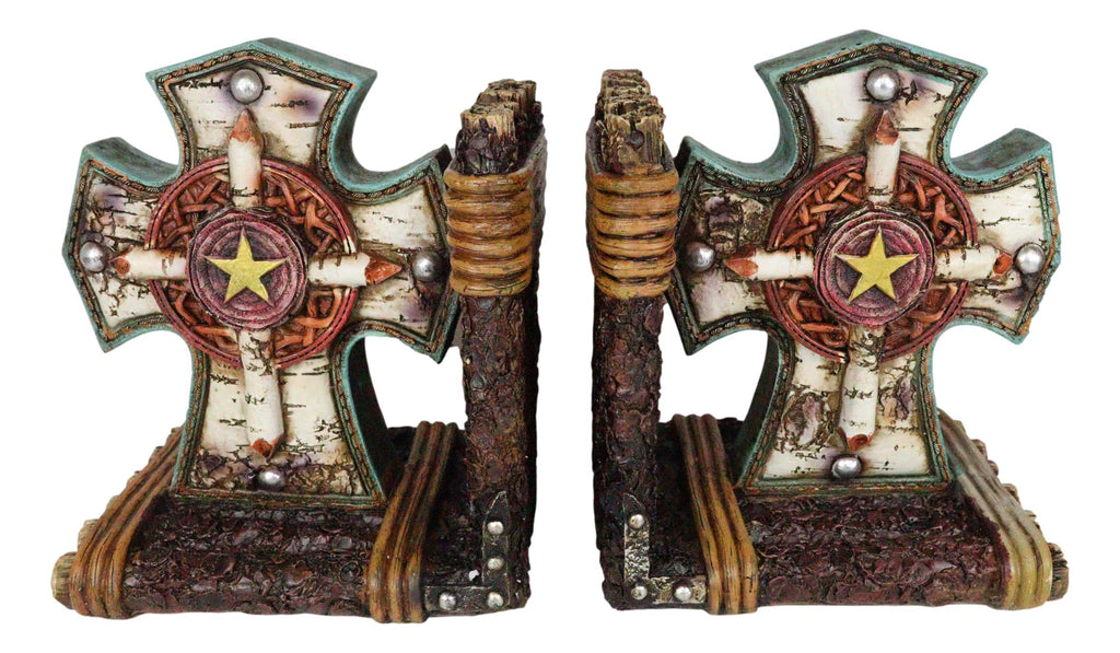 • A pair of truly stylish and inspirational cross shaped bookends will grace your room with a western flair. Starting with redwood logs tied together to form an L-shape, a Celtic High Cross is erected from the base with rustic turquoise colors on the sides and birchwood front body. A western star in gold sits right in the center of the cross, encircled by knotwork patterns all around.