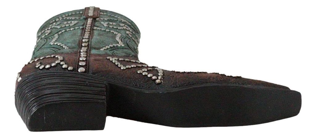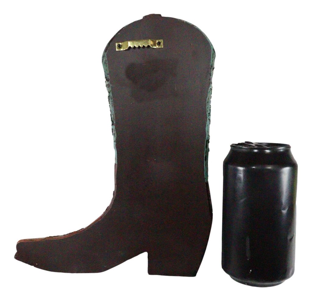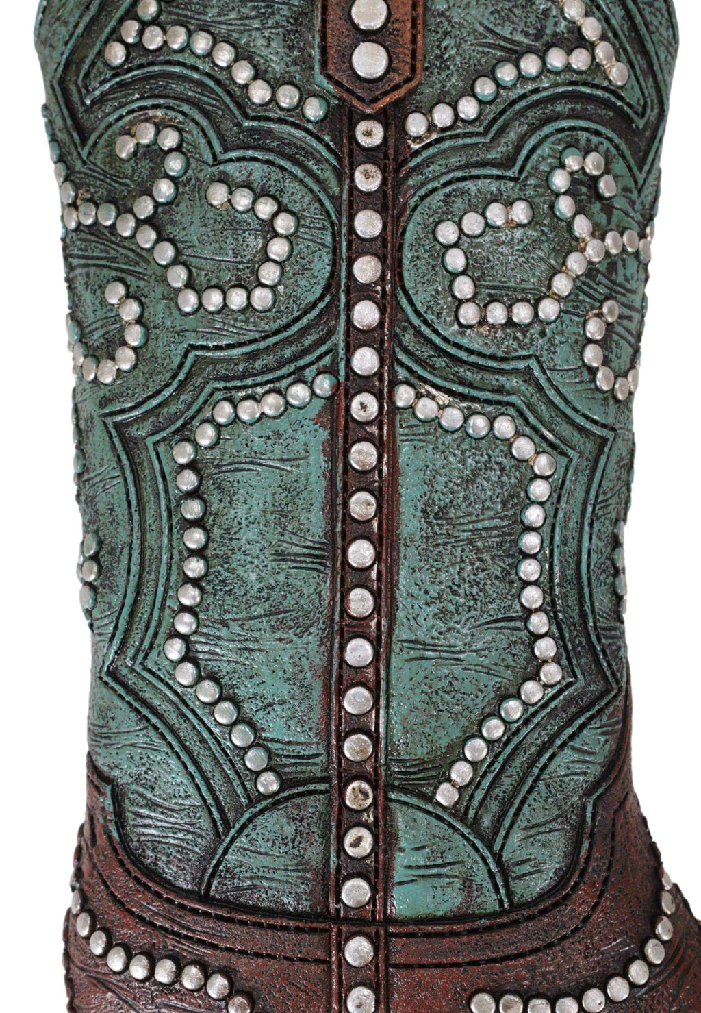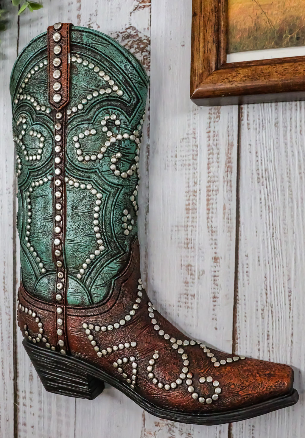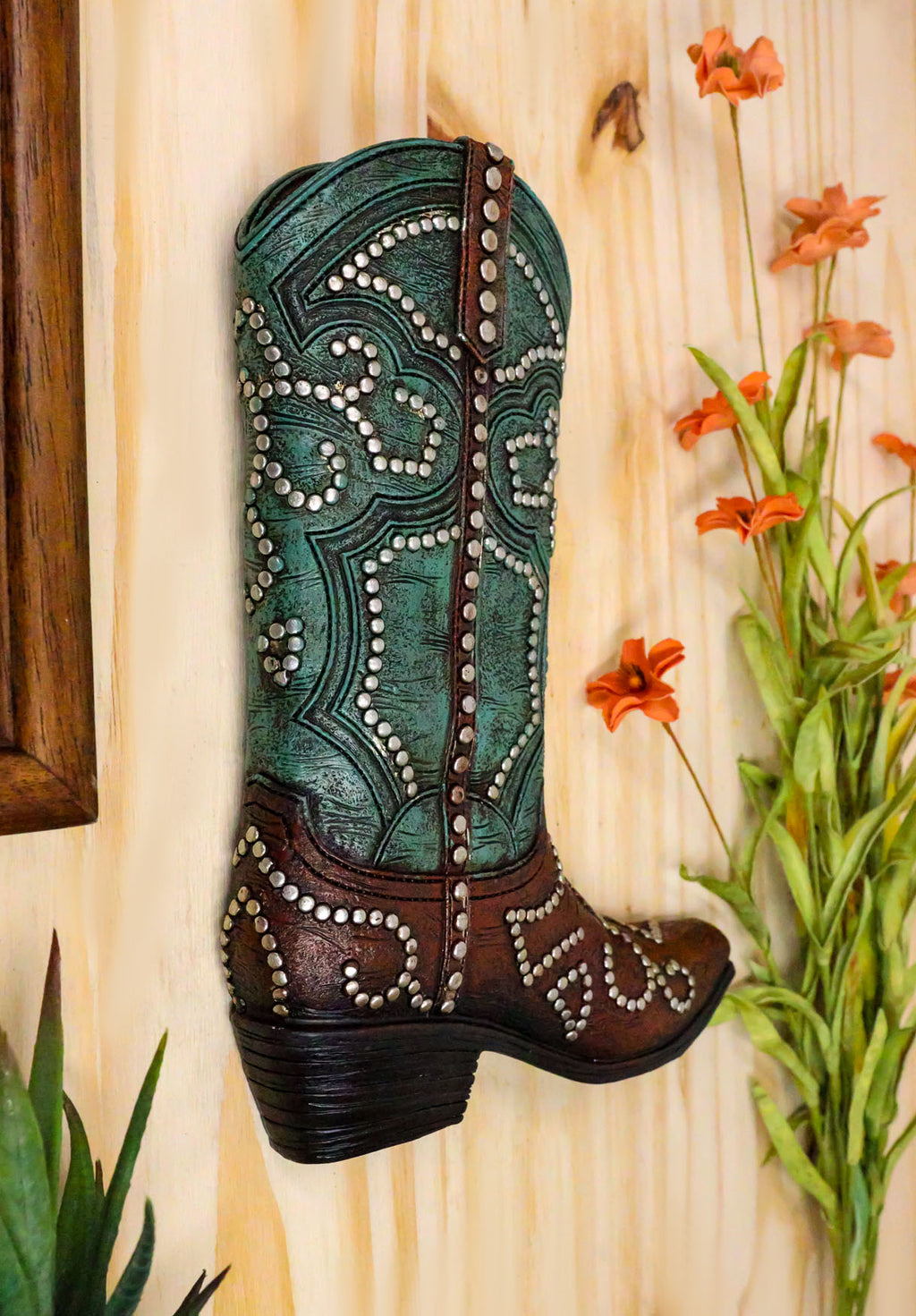 • This faux tooled leather brown and teal cowgirl wall plaque is made of high quality polyresin, hand painted and polished individually. • This faux tooled leather brown and teal cowgirl wall plaque measures approximately 9.25" tall, 7.5" wide and 1.25" thick each. It weighs about 15 ounces. • This is a fun, lightweight southwestern style decor wall hanging of a boot hand painted in faux tooled leather finish. The boot is painted in two tone colors of teal and brown, embellished with silver beads and nailheads. Perfect for any western decore or for that lil cowgirl in your home! • Flowers and props accessories in the pictures are not included with the wall plaque.