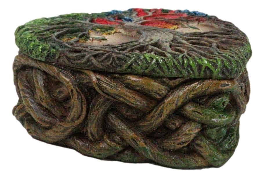• This exquisite Tree Of Life heart box measures 5.5" wide, 5.25" Deep and 2" High approximately. It weighs about 1.5 pounds. • This exquisite Tree Of Life heart box is made of designer polyresin. It is hand painted and polished individually by our artisans. • Discover the enchanting beauty of our Sacred Tree of Life Yggdrasil Decorative Trinket Box, featuring intricate dendritic roots and a vibrant heart-shaped design. This stunning piece symbolizes growth, interconnectedness, and the beauty of life's cycles, making it a meaningful addition to your decor. Perfect for storing small treasures, jewelry, or personal mementos, this colorful box adds a touch of whimsy and spirituality to any space.