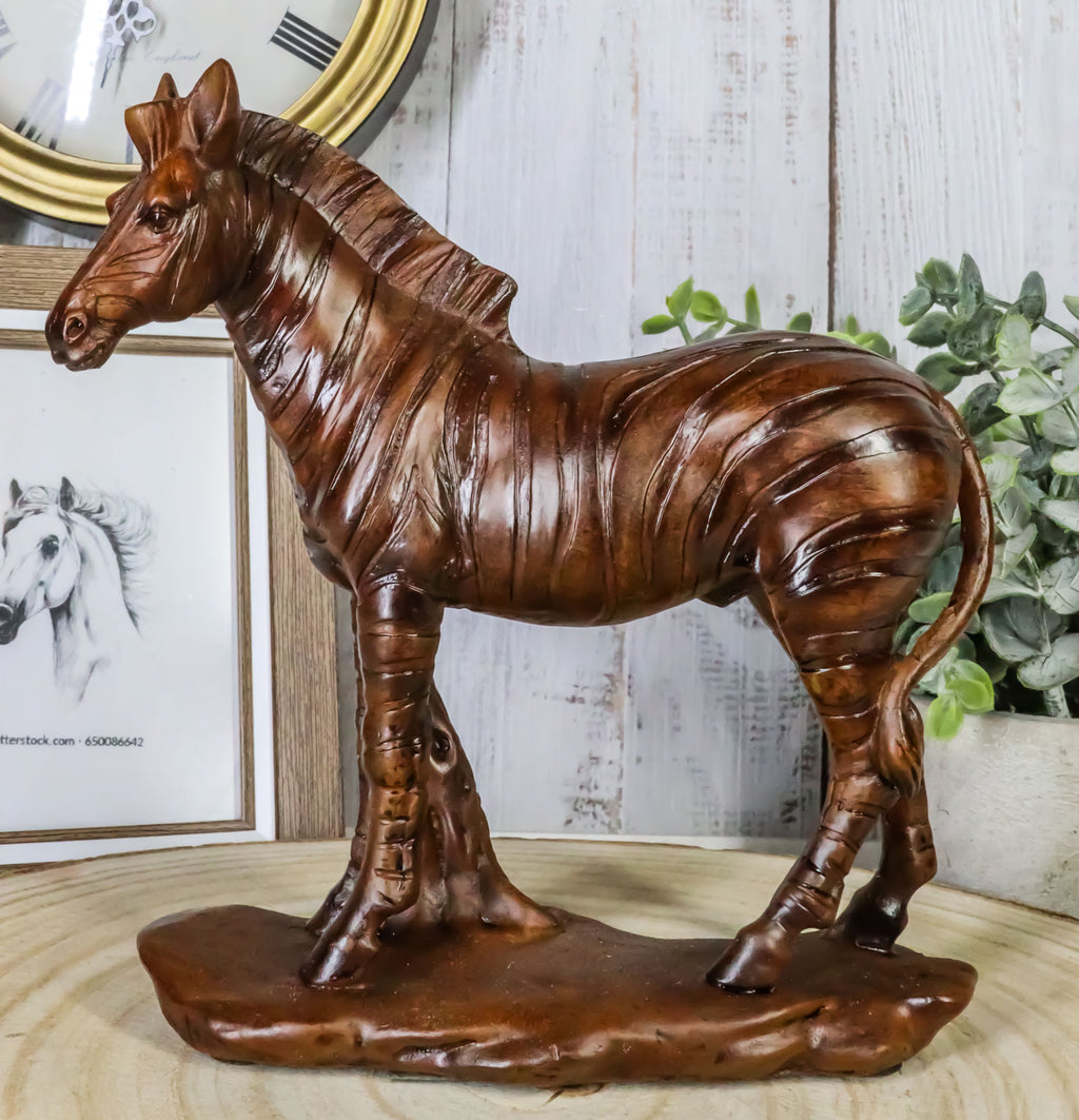 • This Faux Wood Mahogany Finish Zebra Horse figurine measures 6.25" tall, 6.25" long and 2.5" deep approximately. It weighs about 12 ounces. • This Faux Wood Mahogany Finish Zebra Horse figurine is made of high quality designer resin, individually hand painted and polished in faux wood deep mahogany color finish. Color tone may vary from pictures. • This stunning masterpiece zebra horse is painted in deep grain mahogany faux wood base color finish. Because it is made of resin, you barely need to maintain the figurine. This is unlike wood products which require some moisturizing at some point during the life of the figurine. Each piece is beautifully hand painted by our painters, with years of manufacturing experience so you will get a stunning piece every time! • Props in photos are not included with the item.