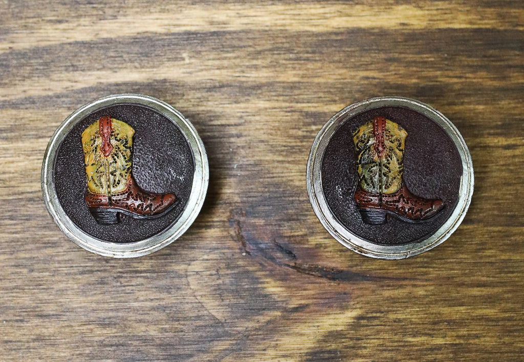 • Add a touch of Western Frontier to your cabinetry/furniture with these figural polyresin cowboy boots door knobs set. Mounting Screws included.