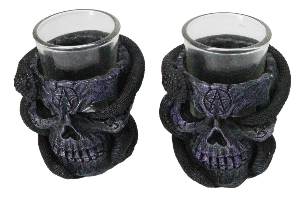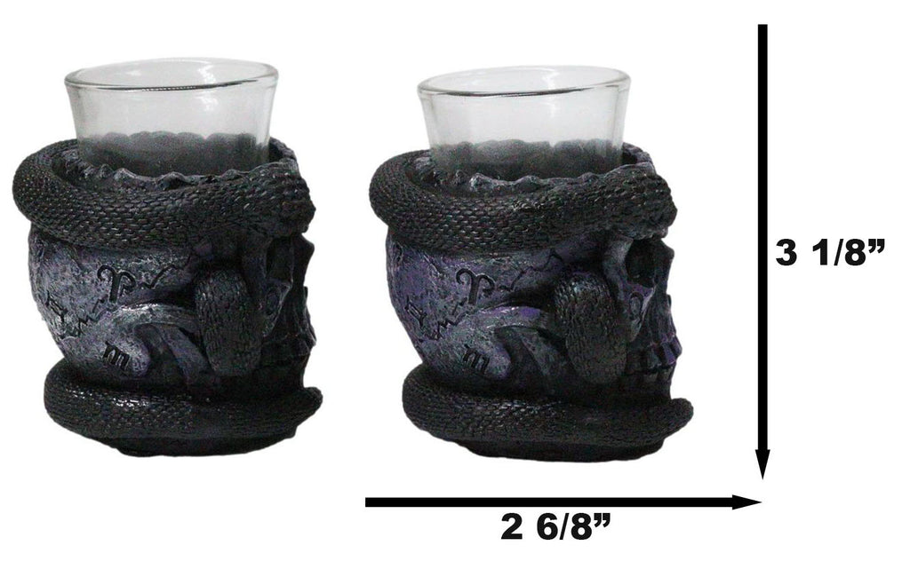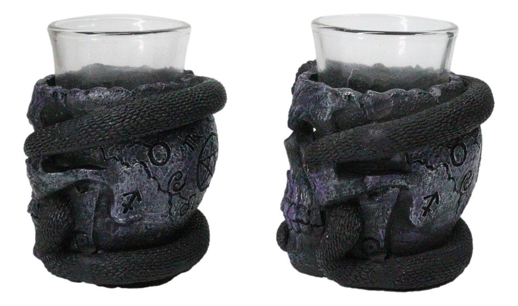 • These Skull and Snake Shot Glasses each measures 3.25" tall, 2.75" wide and 2.5" deep approximately. It holds about 3 fluid ounces. • These Gothic Shot Glasses are made of polyresin with glass inner cup liner. The sculptural housing is hand painted and polished in vivid colors. • Add a dark, dramatic touch to your drinkware collection with these Ossuary Gothic Pentagram Skull and Serpent Shot Glasses. Featuring skull motifs, coiled serpents, and bold pentagram accents, each piece blends eerie elegance with striking detail. Perfect for gothic décor lovers, fantasy fans, or anyone who enjoys unique barware with an edge. A standout addition to parties, displays, or themed gatherings! • This listing is for 2 shot glasses as pictured. Props in photos are not included with the shot glasses.