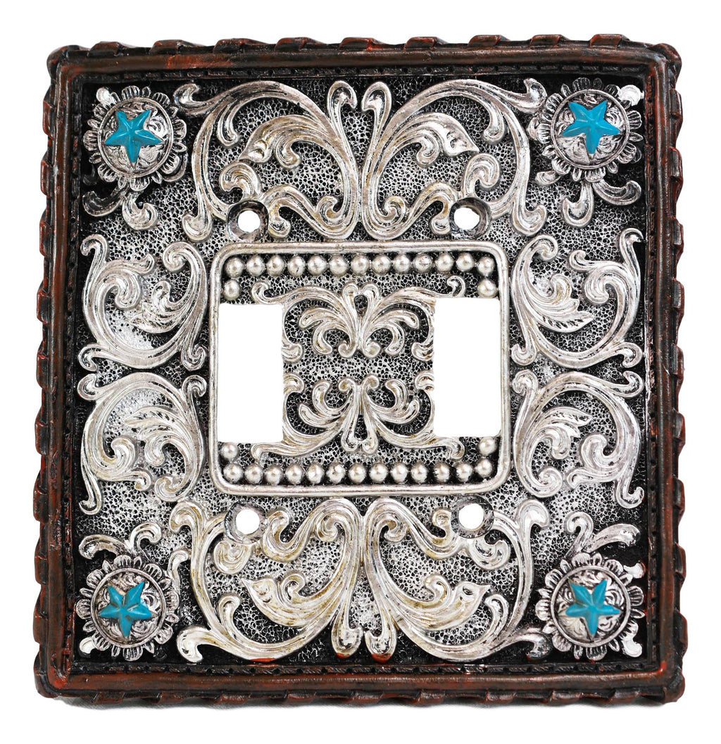 Set of 2 Western Turquoise Stars Lace Scroll Wall Double Toggle Switch Plates
