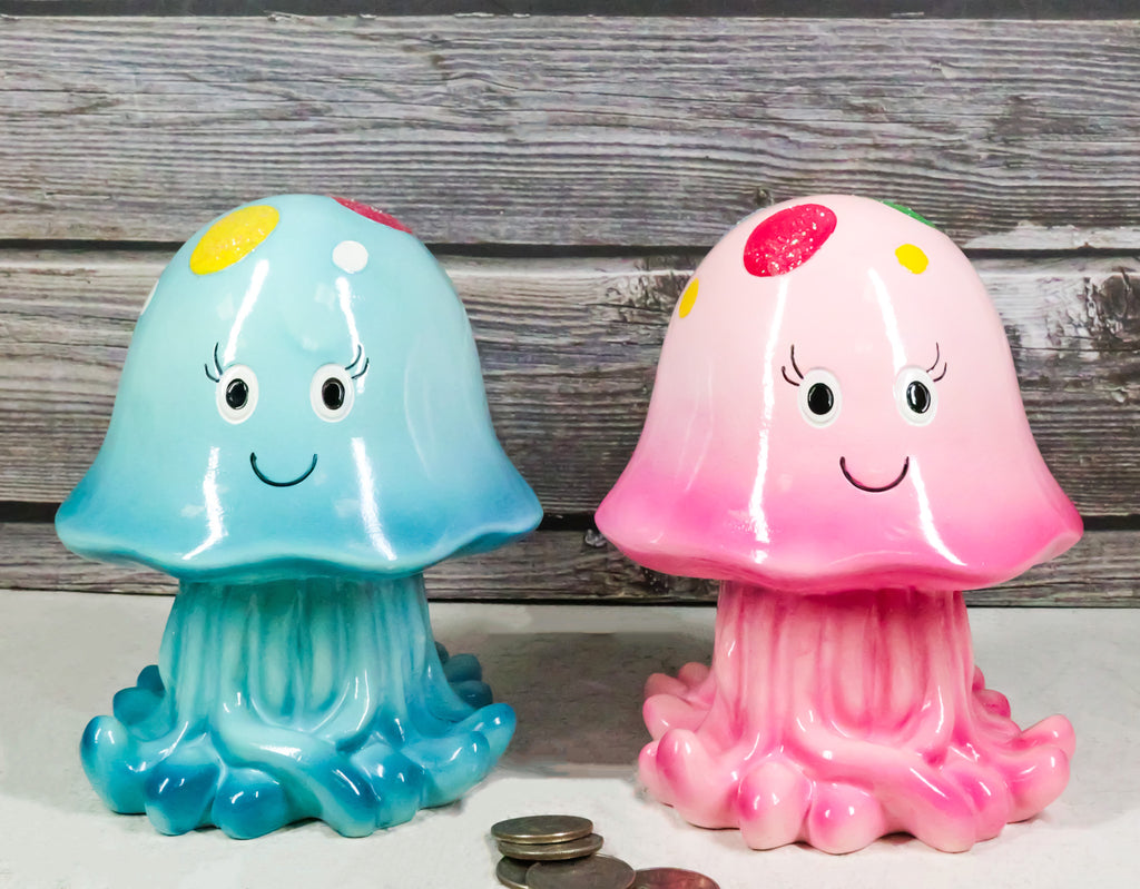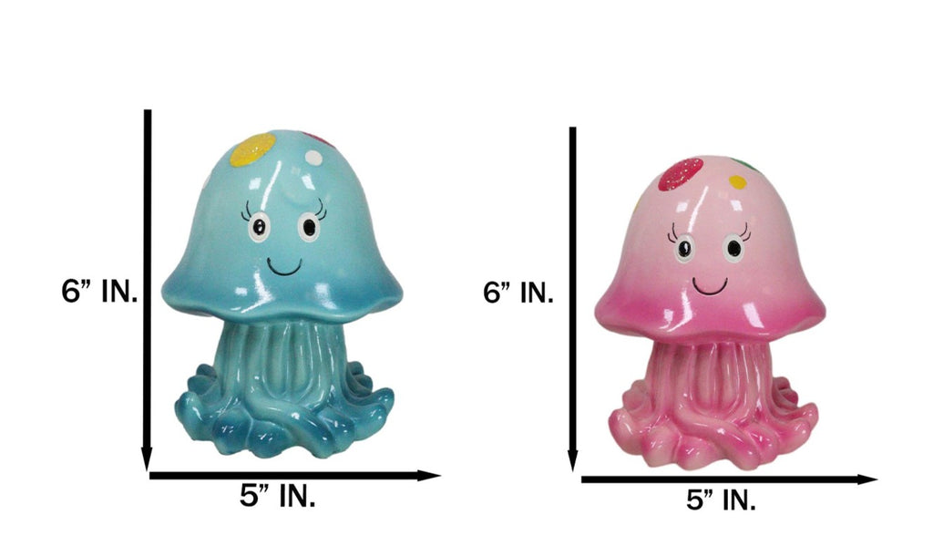 • This Jellyfish money bank sculptures are made of high quality polyresin, hand painted and polished individually. • This Jellyfish money bank sculptures each measures approximately 6" High, 5" Wide and 5" Deep. Each weighs about 14 ounces. • Dive into savings with our Whimsical Sea Jellyfish Piggy Bank! This charming design features a playful Jellyfish , adorned with vibrant colors and intricate details that bring the ocean to life. Perfect for ocean lovers, this delightful piggy bank makes saving money an adventure under the sea. Whether as a gift or a unique decor piece, this adorable Jellyfish will inspire a love for saving while adding a splash of nautical charm to any space! • Props and coins in photos are not included with the items. The listing comes as a pack of 2 money banks as pictured.