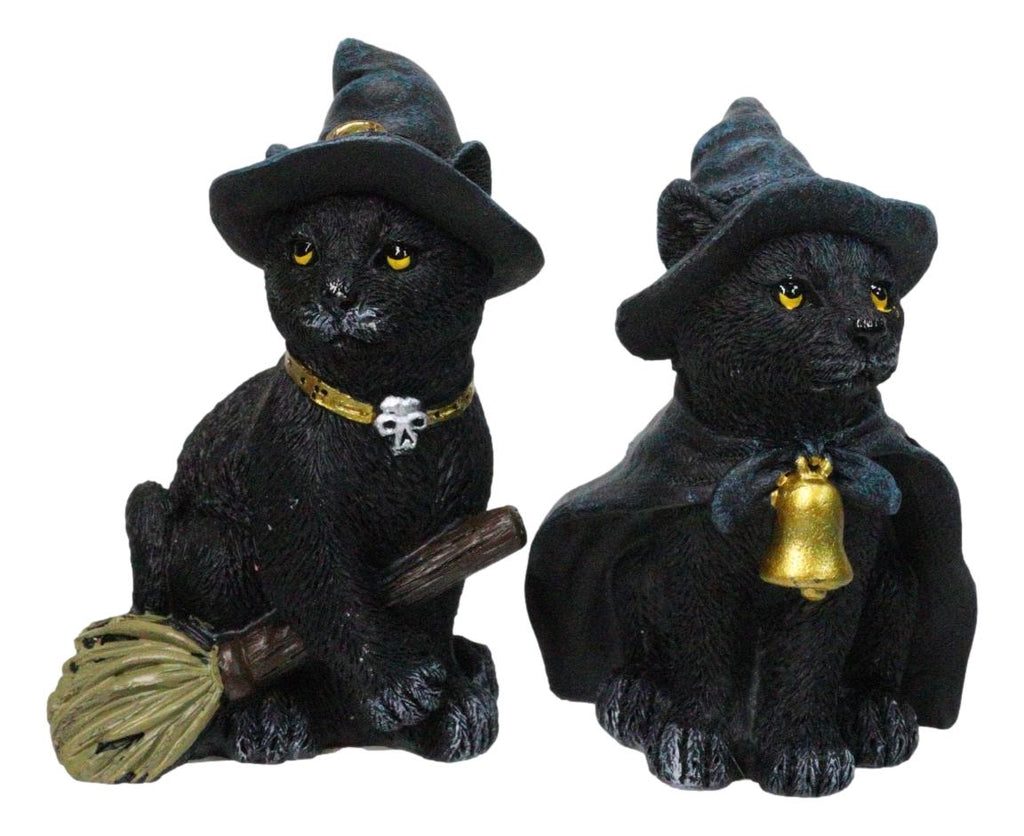 • These Witching Hour Black Cat Figurines measures about 2.5"-3" tall, 2" long and 2" deep approximately. The set of 4 weighs about 13 ounces. • These Witching Hour Black Cat Figurines are made of polyresin, hand painted and polished individually. • Add a spellbinding charm to your seasonal décor with this Set of 4 Black Cat Mini Figurines. Each mischievous cat comes dressed for the occasion-wearing a witch hat, and equipped with one of these; flowing cape, broomstick, or a mystical pentagram pendant. Crafted with whimsical detail, these mini figurines are perfect for decorating shelves, mantels, or Halloween displays. • Props in photos are not included with the item.
