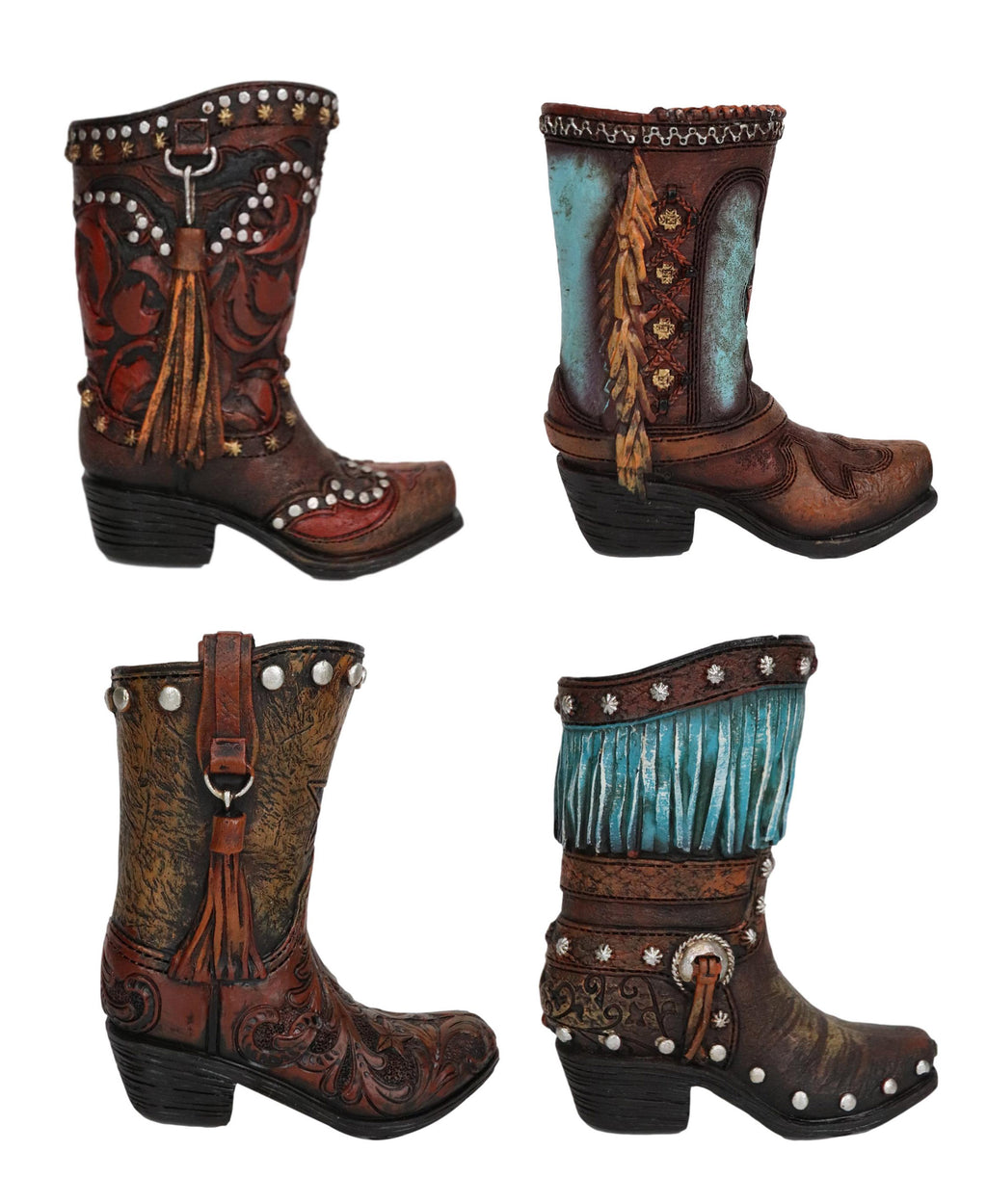 • These cowboy/cowgirl boots stationery holders are made of high quality polyresin, hand painted and polished individually. • These cowboy/cowgirl boots stationery holder each measures approximately 4.5" tall, 4.5" wide and 2.25" deep. Each boot weighs about 4 ounces. • Spice up your decor with these cowboy/cowgirl boots accent sculpture. These boots do double duty as pen/stationery or makeup brushes/tools holder as well as an attractive accent piece for your shelves, desks and more. Intricately hand crafted and painted in multi colors, the boots are detailed with southwestern tassels/frills and turquoise designs. The boots are also finished in faux tooled leather look. From a distance, you are gonna think they are real miniature leather boots! • Props in photos are not included with the items. This listing comes as a pack of 4 boot stationery holders.