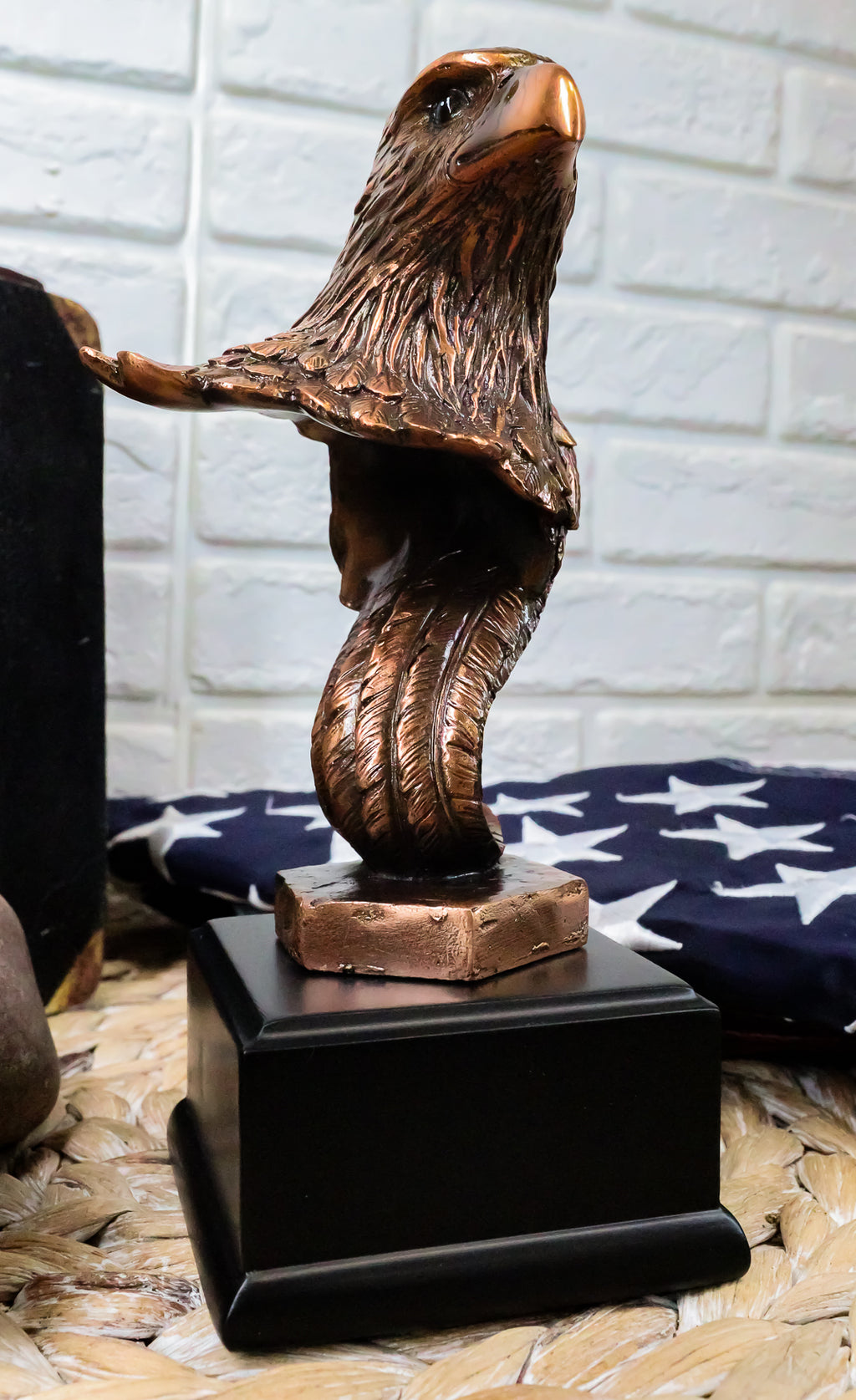 • This Impressive Bald Eagle Bust Sculpture is made of the highest quality resin, undergoing the process of bronze electroplating giving it a uniform shine on the inside as well as the surface of the figurine. To add sculptural aesthetics and display worthiness, we add accent faux black wooden base to the sculpture.
