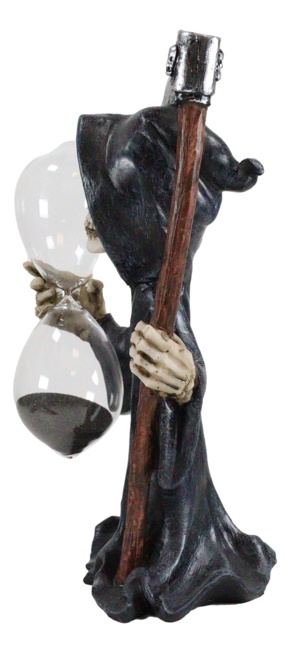• This Grim Reaper Sand Timer Sculpture is made of designer composite resin, hand painted and polished individually. The sands in the glass column are black in color.