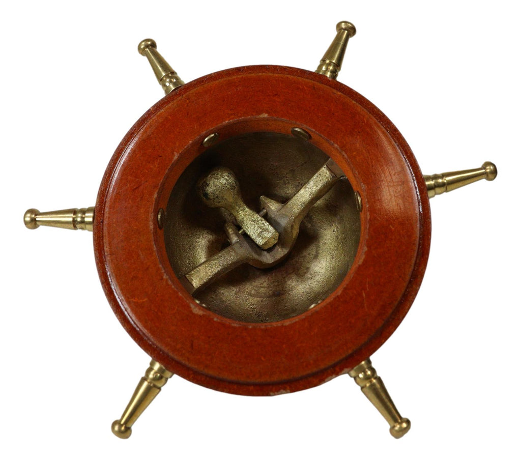 • This vintage brass hotel or service bell would be wonderful at the front desk of a store, hotel, or other business. It is nautical themed and has a ship helm shaped base. The bell has a button on the top which moves the interior "clacker" to ring the bell.