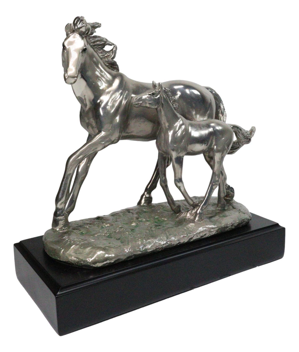 • This Horse And Foal Figurine is made of the highest quality resin, undergoing the process of chrome silver electroplating giving it a uniform shine on the inside as well as the surface of the figurine. • This Horse And Foal Figurine measures 9.5" tall (including its base), 9.25" long and 4.5" deep approximately. It weighs about 4 pounds. • Celebrate the beauty of the Wild West with this Western Horse and Foal Chrome Silver Electroplated Resin Figurine. Expertly crafted with a sleek chrome-like silver finish, this elegant sculpture captures the tender bond between a horse and its foal. Set on a sturdy black base, it makes a striking display piece for equestrian lovers, Western décor, or collectors of fine figurines. • Props in photos are not included with the item. They are meant to provide size perspective of the item.