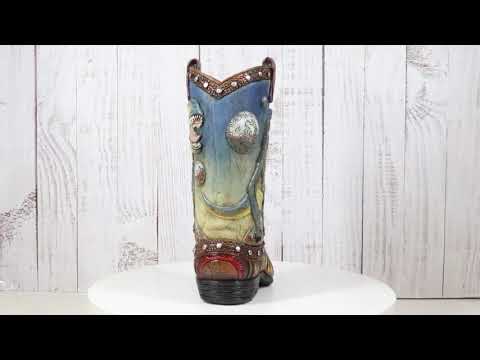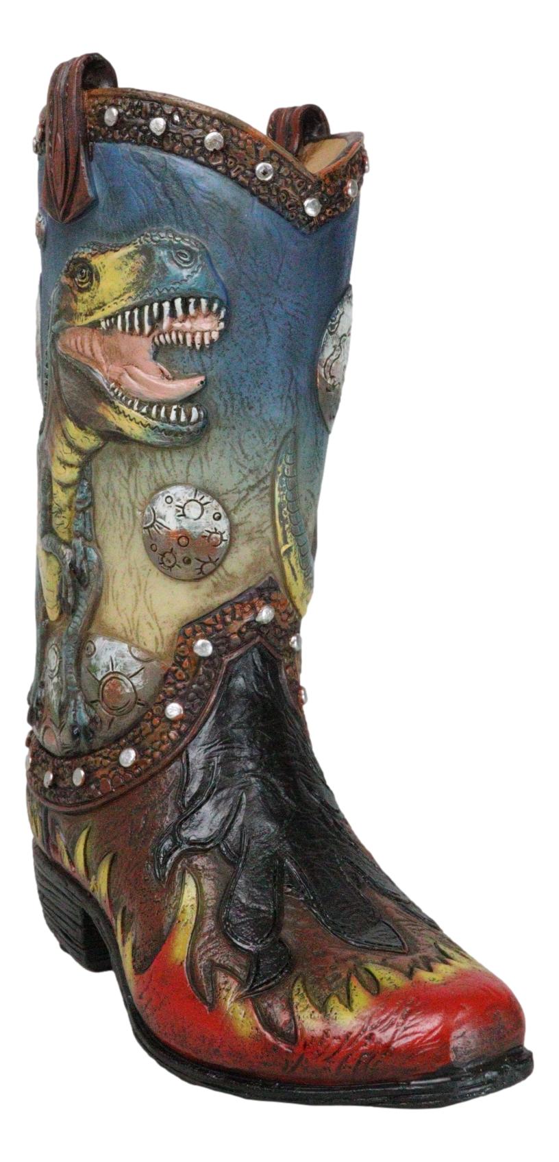 • This Wild West Dinosaur Cowboy Boot Vase is made of high quality polyresin, hand painted and polished individually. • This Wild West Dinosaur Cowboy Boot Vase measures approximately 9.25" tall, 7.25" wide and 3.5" deep each. It weighs about 1.75 pounds. • Our curated collection of boots present quality, affordable luxury designer bedroom, bath, kitchen, and home décor designs that exemplify the rustic western style! • Introducing the Wild West Prehistoric T-Rex Dinosaur Faux Leather Cowboy Boot Vase, a truly unique and imaginative decor piece that combines the excitement of the Wild West with prehistoric wonder. This eye-catching figurine features a fierce T-Rex dinosaur set against a backdrop of a fiery volcano, symbolizing raw power and prehistoric history. The base is a creatively designed cowboy boot made of faux leather, adding a rustic Western charm. • Props in photos are not included with the boot. This item is NOT a wearable boot. It is strictly a decorative sculpture, for flowers, kitchen utensils and the like.