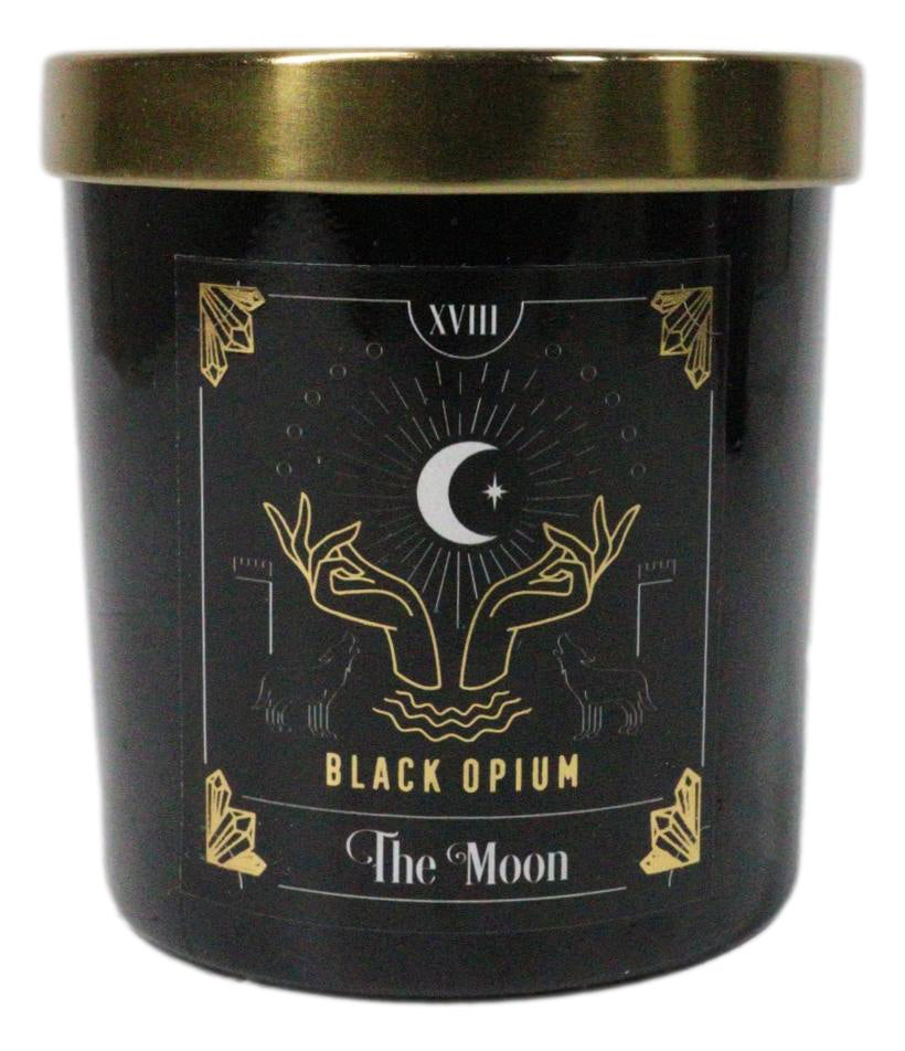 • This Tarot Card Wiccan Candle is made of paraffin wax in various scents. • Approximate Burn Time 25 hours. Please practice caution when burning and never leave lit candle unattended. • Candle Dimensions: 3" high and 3" diameter. It weighs about 12 ounces. Made in India. • Inspired by traditional tarot card designs, this lidded candle features a stunning celestial moon design and comes in a black opium fragrance. • Props in photos are not included with the item.