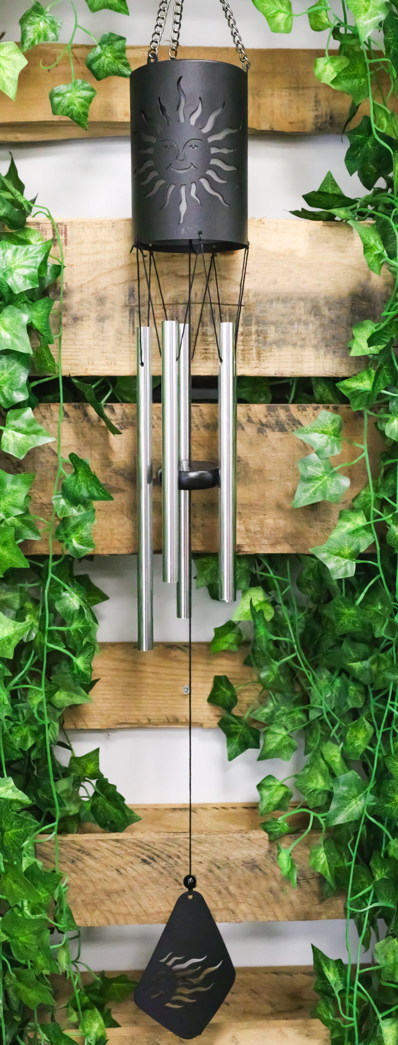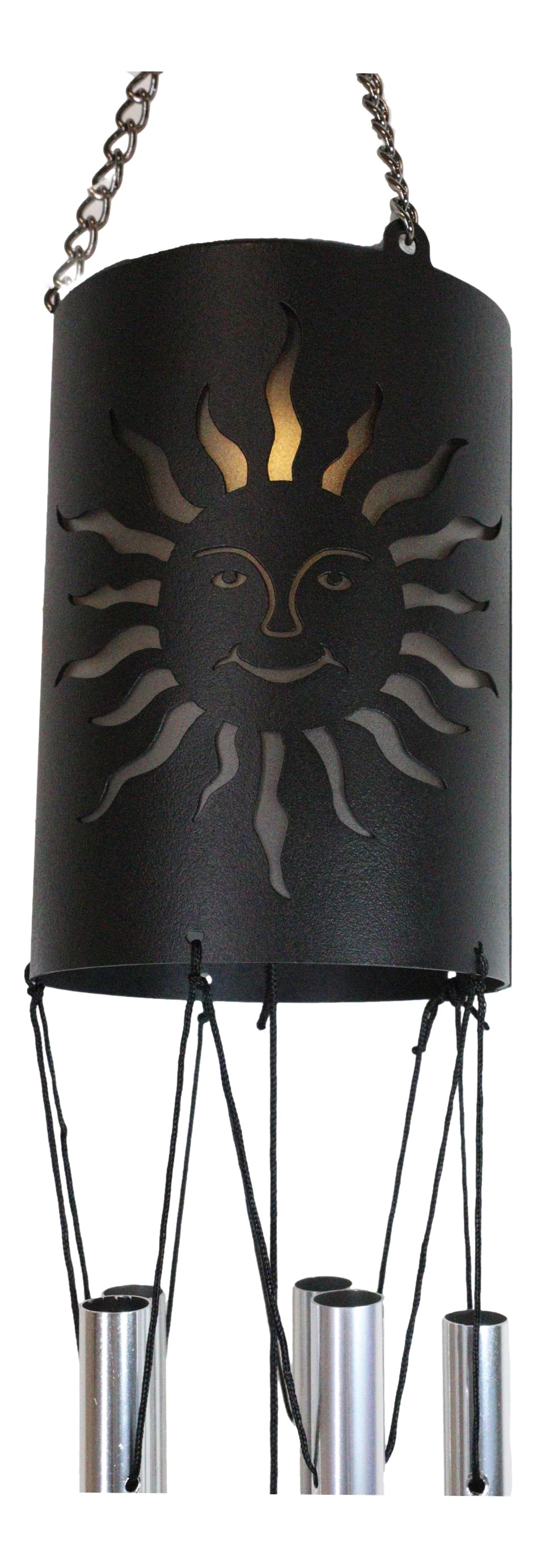 • This Artistic Filigree Metal Solar Wind Chime is approximately 40" Tall from the base of the chime to the top of the hook. The cylindrical body is about 3.5" in diameter. • This Artistic Filigree Metal Solar Wind Chime is made of steel metal, powder coated in black. • Bring celestial energy to your outdoor space with this Belenos Sun God Hanging Solar Wind Chime. This striking piece features intricate sun-themed filigree designs inspired by the ancient solar deity Belenos, glowing beautifully at night with solar-powered illumination. Crafted from durable black-coated steel, it combines soothing wind chime sounds with radiant solar light, creating a mystical and tranquil ambiance for your garden, patio, or balcony. • Props in photos are not included with the item.
