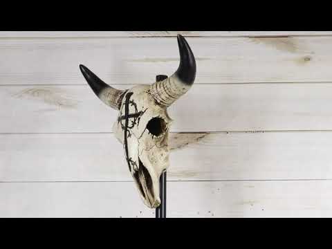 • This Bison Skull Replica hangs on one screw on the wall. It is highly recommended to anchor drywall before hanging the wall decor. Props and Mounting base in the photos/video are not included with the wall decor.
