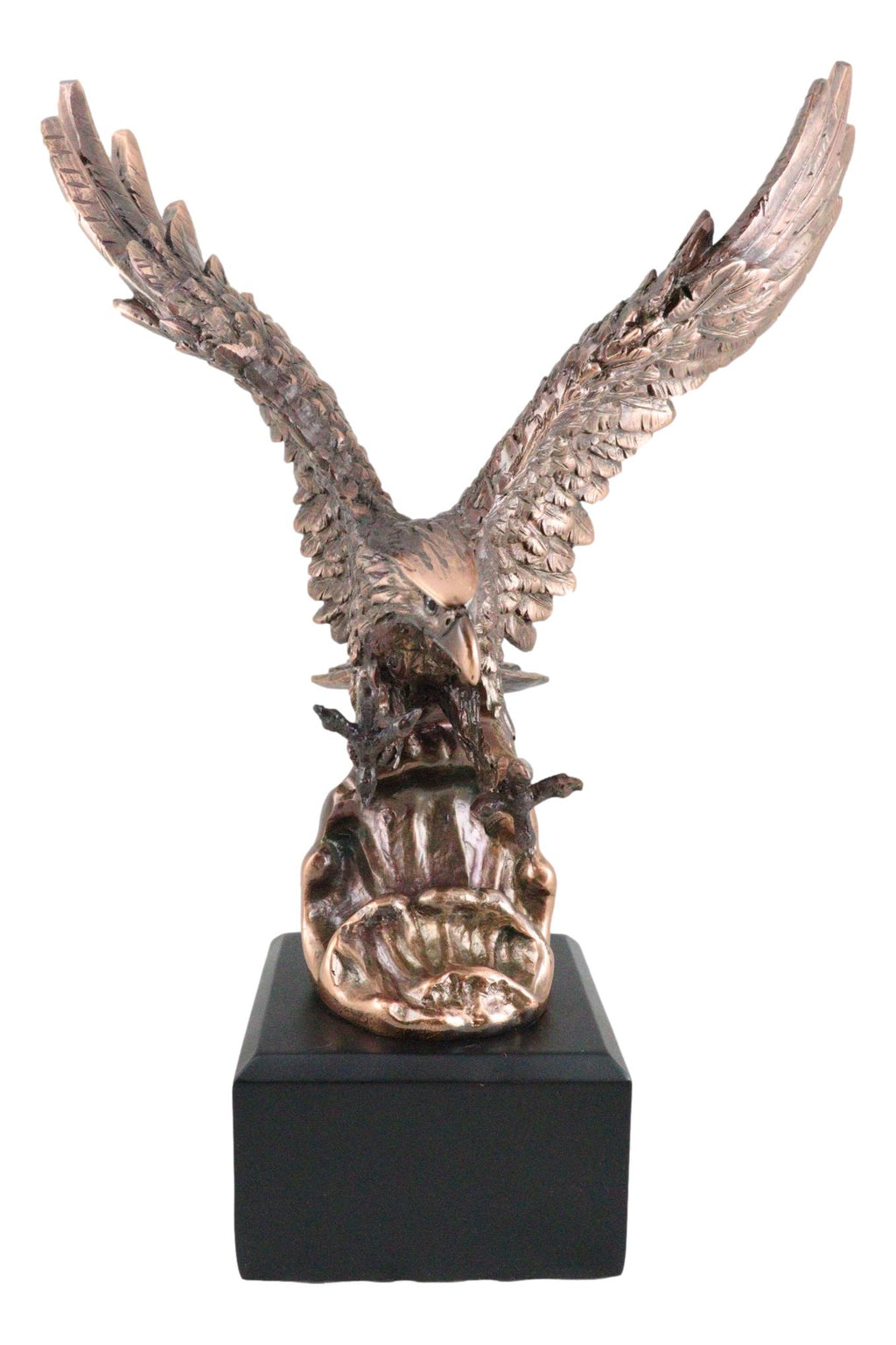 • This Majestic Bald Eagle Figurine is made of the highest quality resin, undergoing the process of bronze electroplating giving it a uniform shine on the inside as well as the surface of the figurine. To add sculptural aesthetics and display worthiness, we add accent faux black wooden base to the sculpture.
