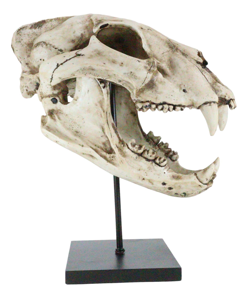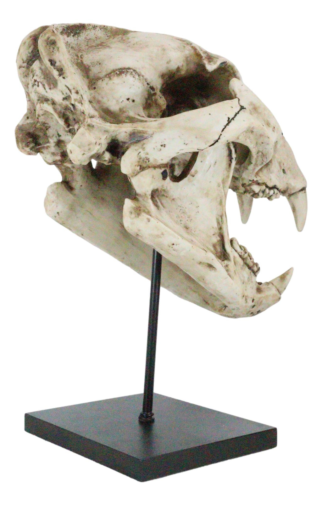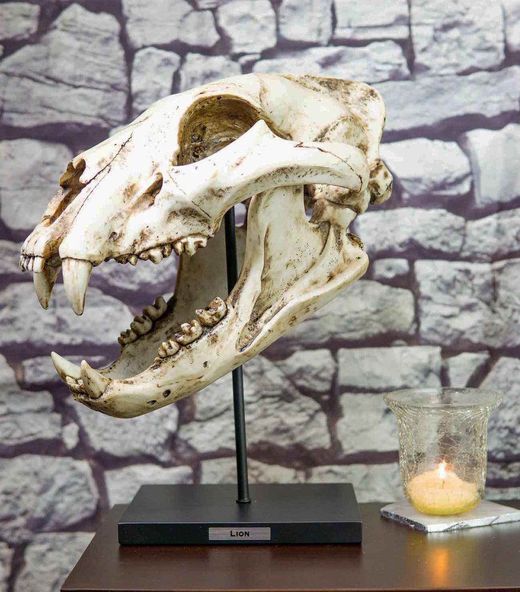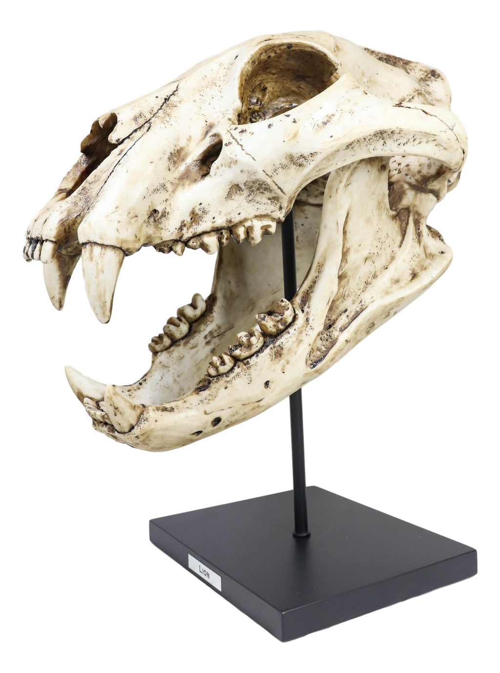 • This aged bone finish lion skull figurine is a convincing lion statue with a handsomely molded snout, powerful huge jaw bone and captivating, jagged razor sharp teeth. The museum showcasing mount provided will bring out the intricate details of the skull as well as create a WOW factor to your decore. The display sculpture mount has a brass name plate that spells out Lion.