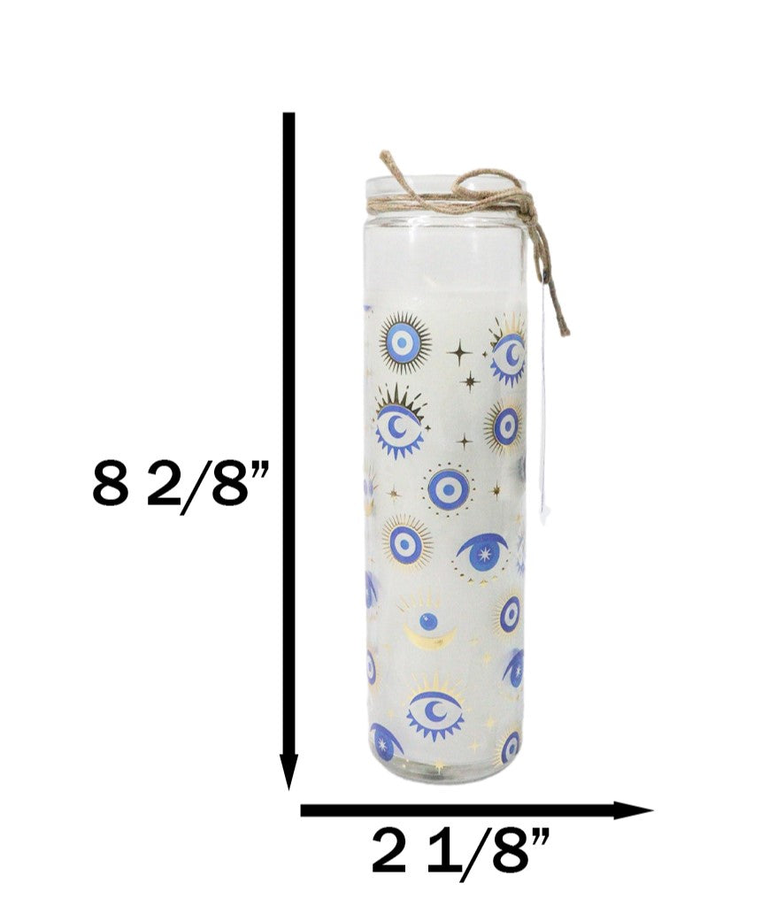 • This Tall Tube Candle is made of paraffin wax in various scents. • Approximate Burn Time 50 hours. Please practice caution when burning and never leave lit candle unattended. • Candle Dimensions: 8.25" high and 2.25" diameter. It weighs about 1.5 pounds. Made in India. • Inspired by traditional 7 day prayer candles, this All Seeing Eye tube candle comes in a lovely white sage fragrance and is perfect for warding off negative energies. • Props in photos are not included with the item.