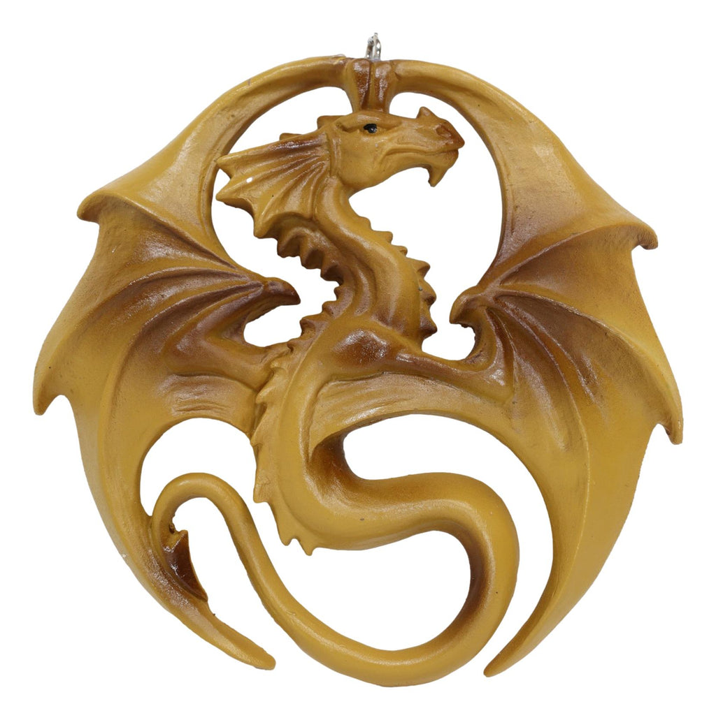 • This Anne Stokes Dragon Sculpture measures 5.25" high, 5" wide and 0.5" deep approximately. The string hangs down about 4". It weighs about 4 ounces.
