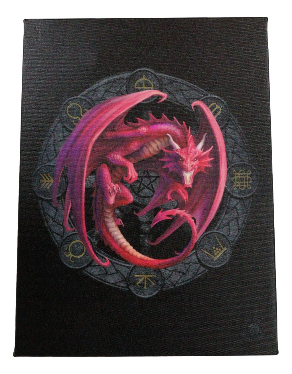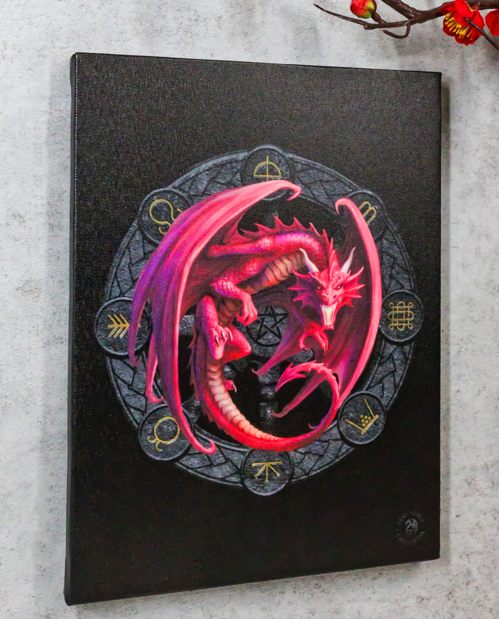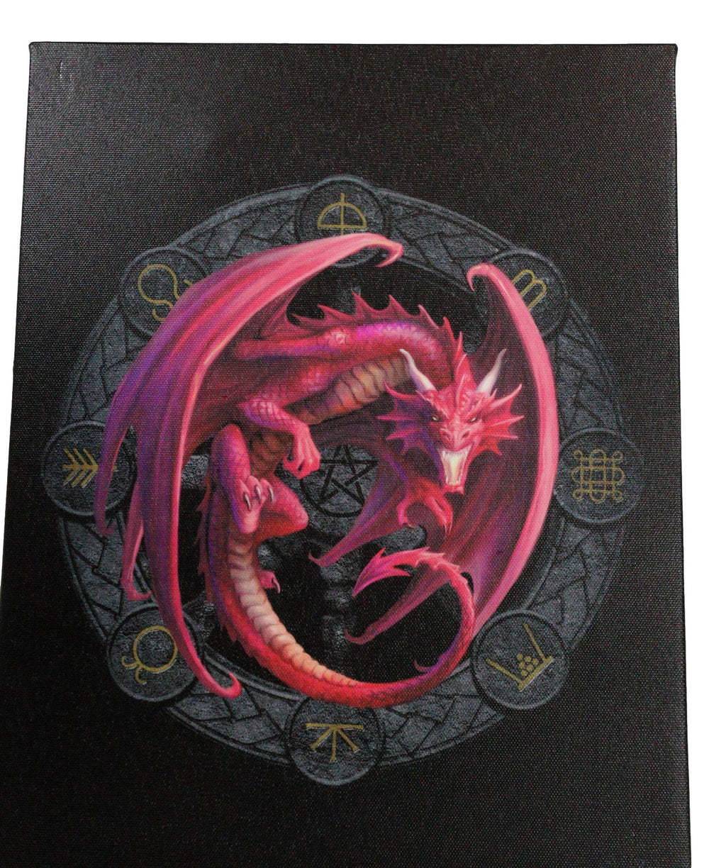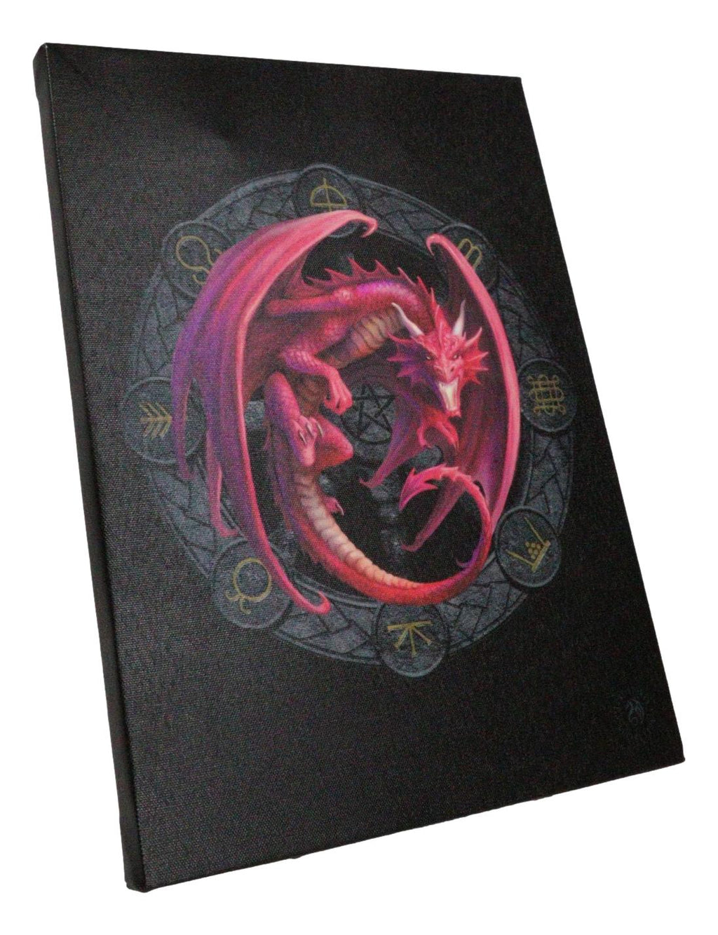 • This Anne Stokes Wheel Of The Year Dragon Sabbat Artwork is made of high quality printed canvas, hand stretched and stapled to a durable shrink resistant textured wood frame. It is also gallery wrapped with images mirrored/continued onto the sides of the frame. Color tone may vary slightly from pictures.