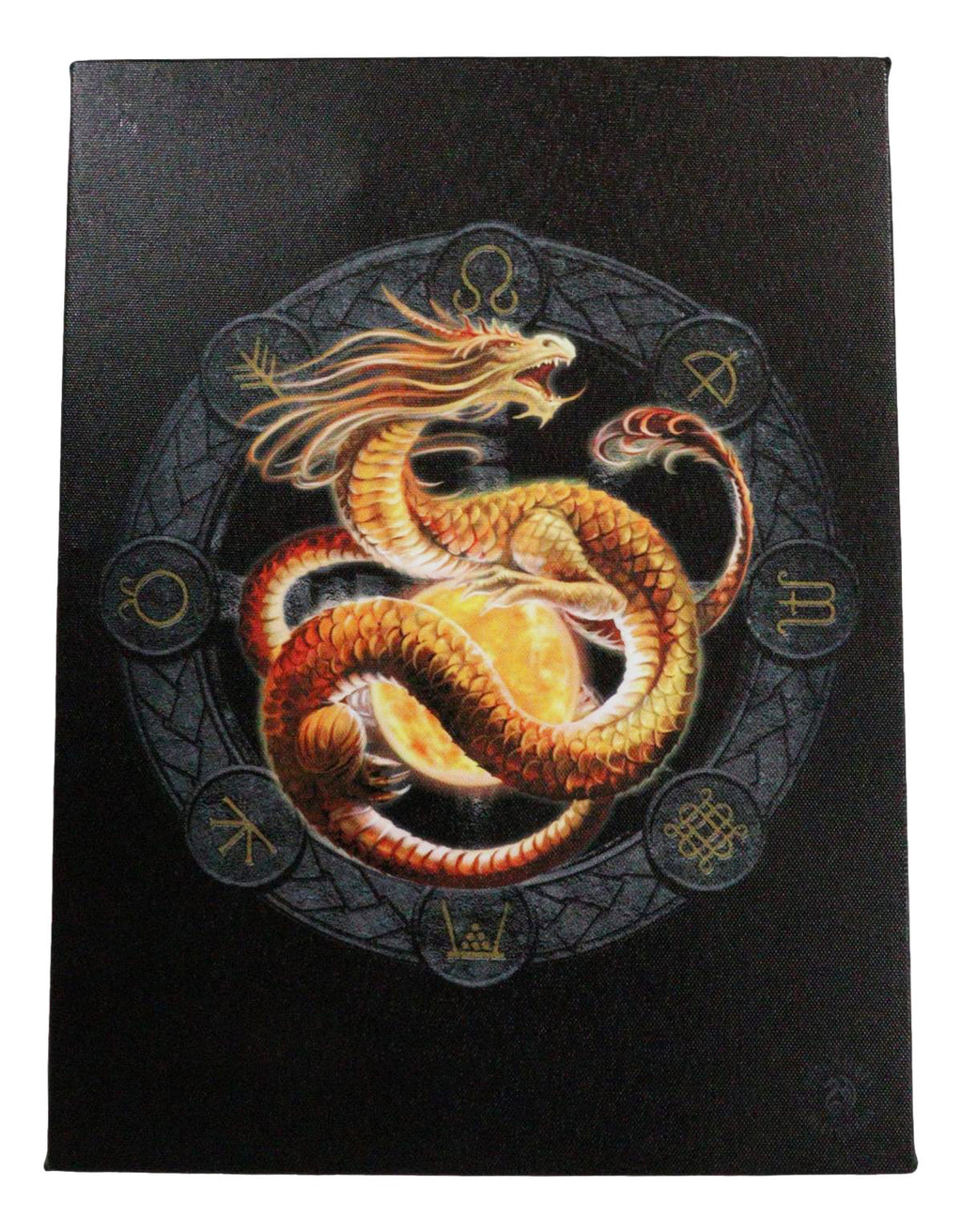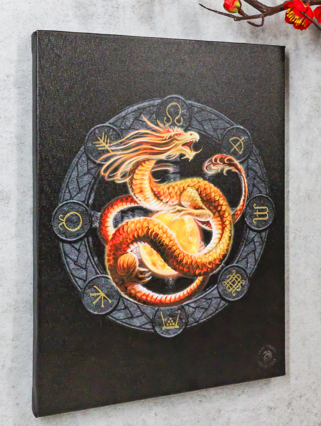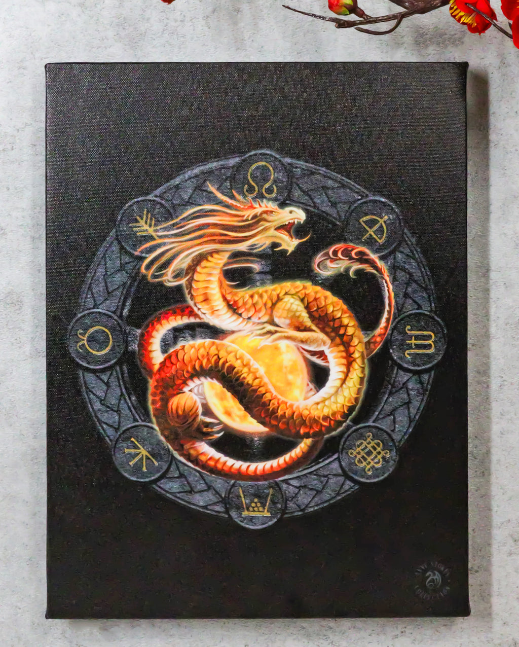 • This Anne Stokes Wheel Of The Year Dragon Sabbat Artwork is made of high quality printed canvas, hand stretched and stapled to a durable shrink resistant textured wood frame. It is also gallery wrapped with images mirrored/continued onto the sides of the frame. Color tone may vary slightly from pictures.