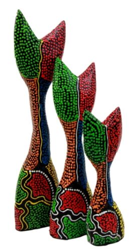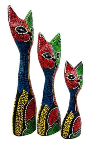 Balinese Wood Handicrafts Abstract Colorful Feline Cat Family Set of 3 Figurines