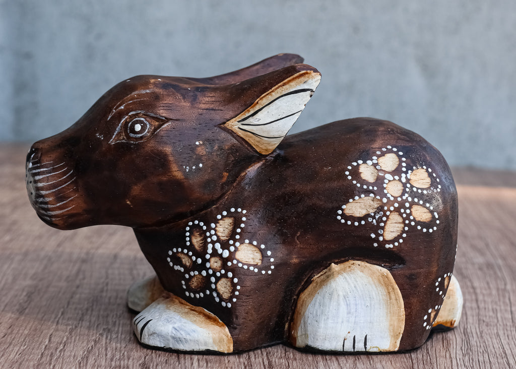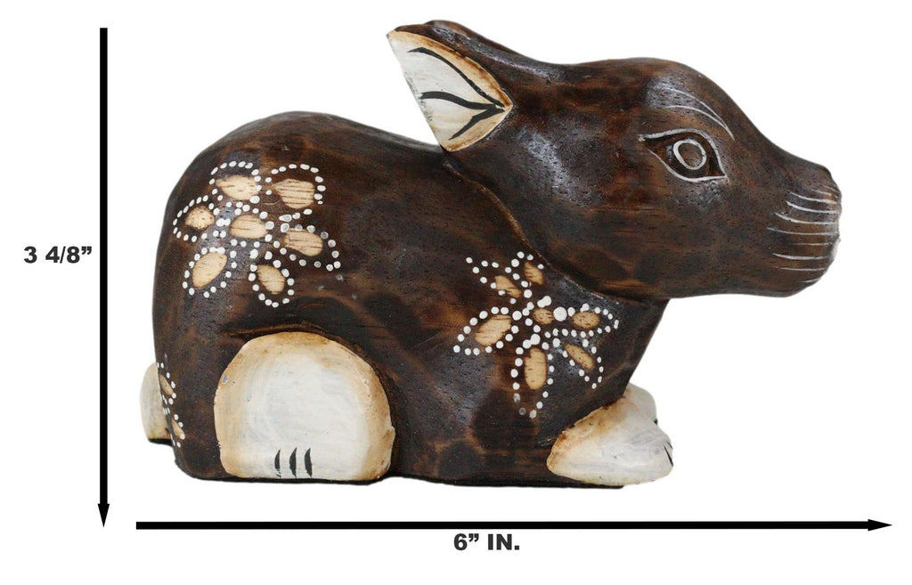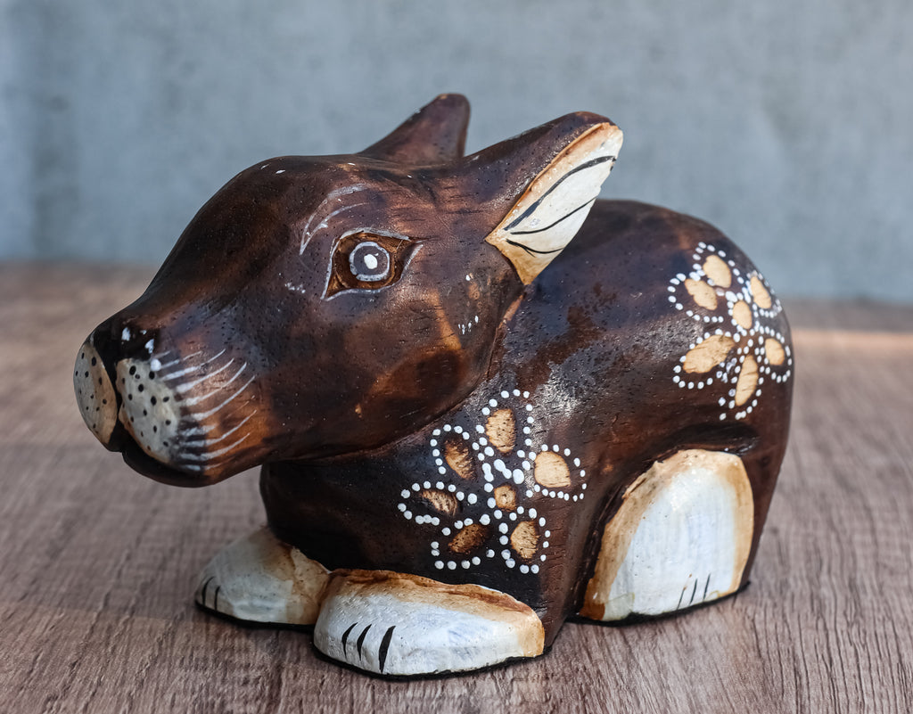 • This adorable figurine was hand carved out of albesia wood, dried in a furnace kiln before being polished and painted individually by our expert artisans. This rabbit features skilled motif painting on the body. It will make perfect decoration to any desks, shelves or what have you!