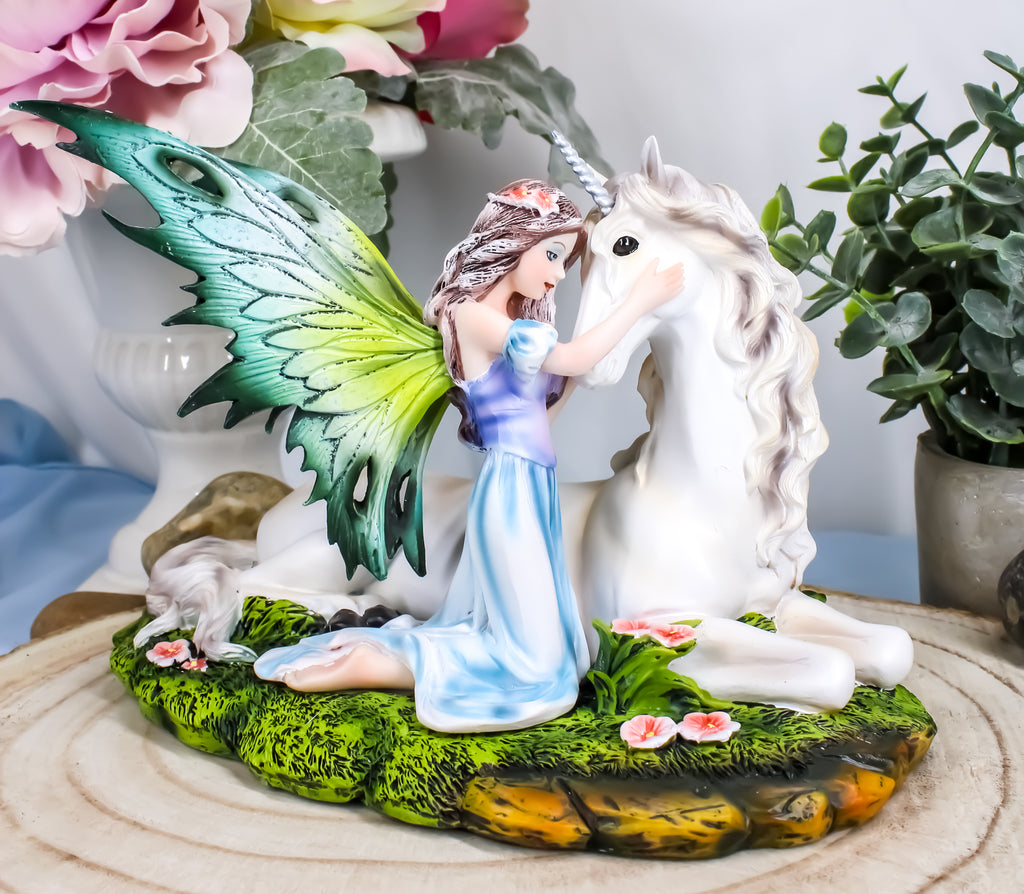 • Faires and unicorns are the best of friends! This little pixie sits with her equine friend. The fae wears a dress of lavender and pale blue, and her wings are done in shades of green. Flowers adorn her hair, and more blossoms bloom near where she and the ivory unicorn rest. A magical piece, and sure to delight all who see it!