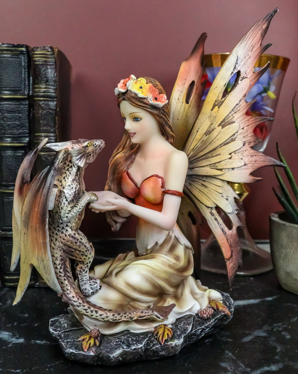 • This item depicts a beautiful Scarlet Fire fairy with flower wreath around her hair training her pet spotted dragon. It is truly a unique fantasy statue that is perfect for any fairy and dragon lover! Props in photos are not included with the item.