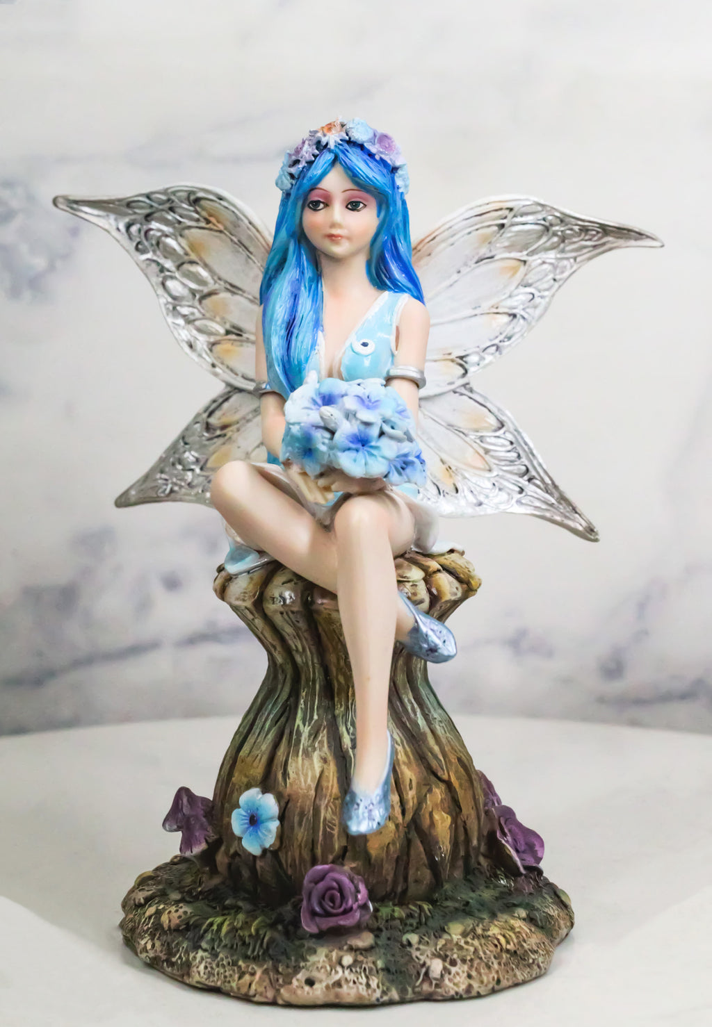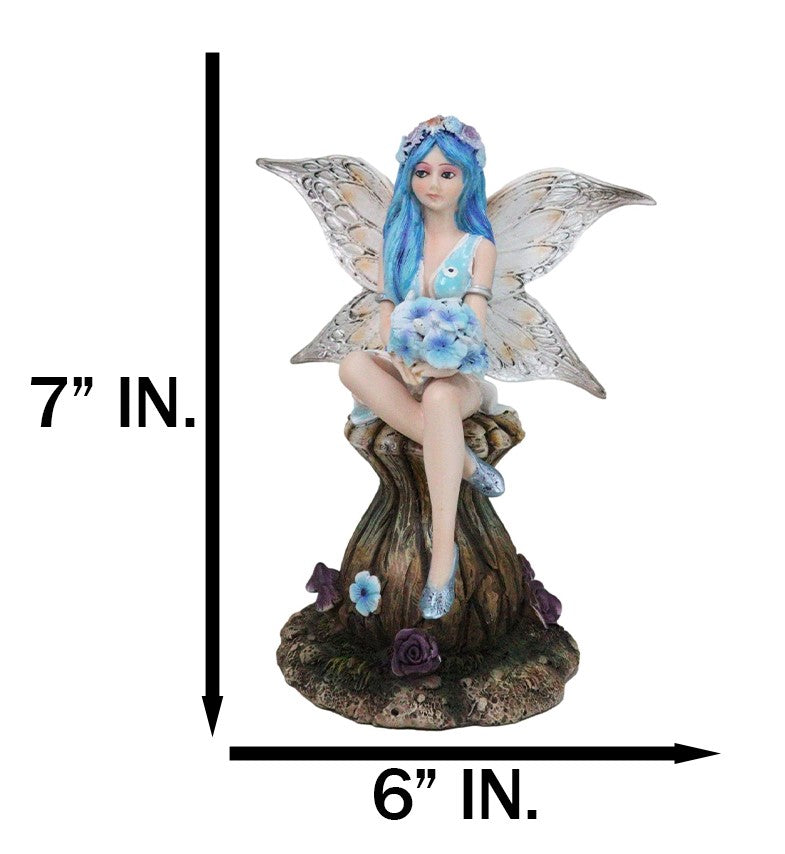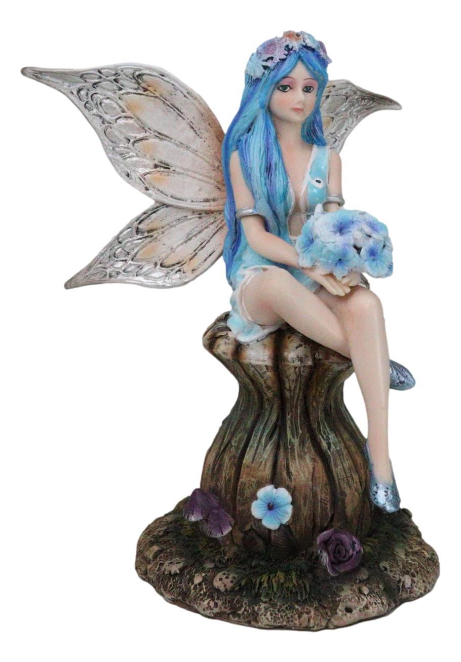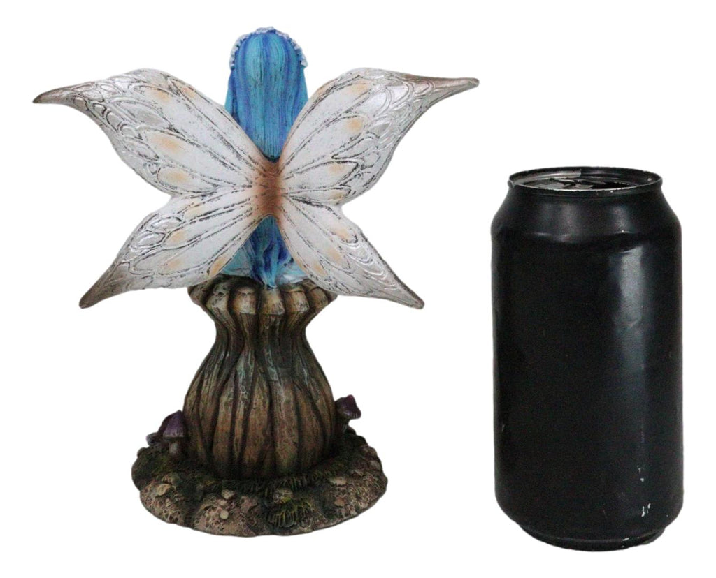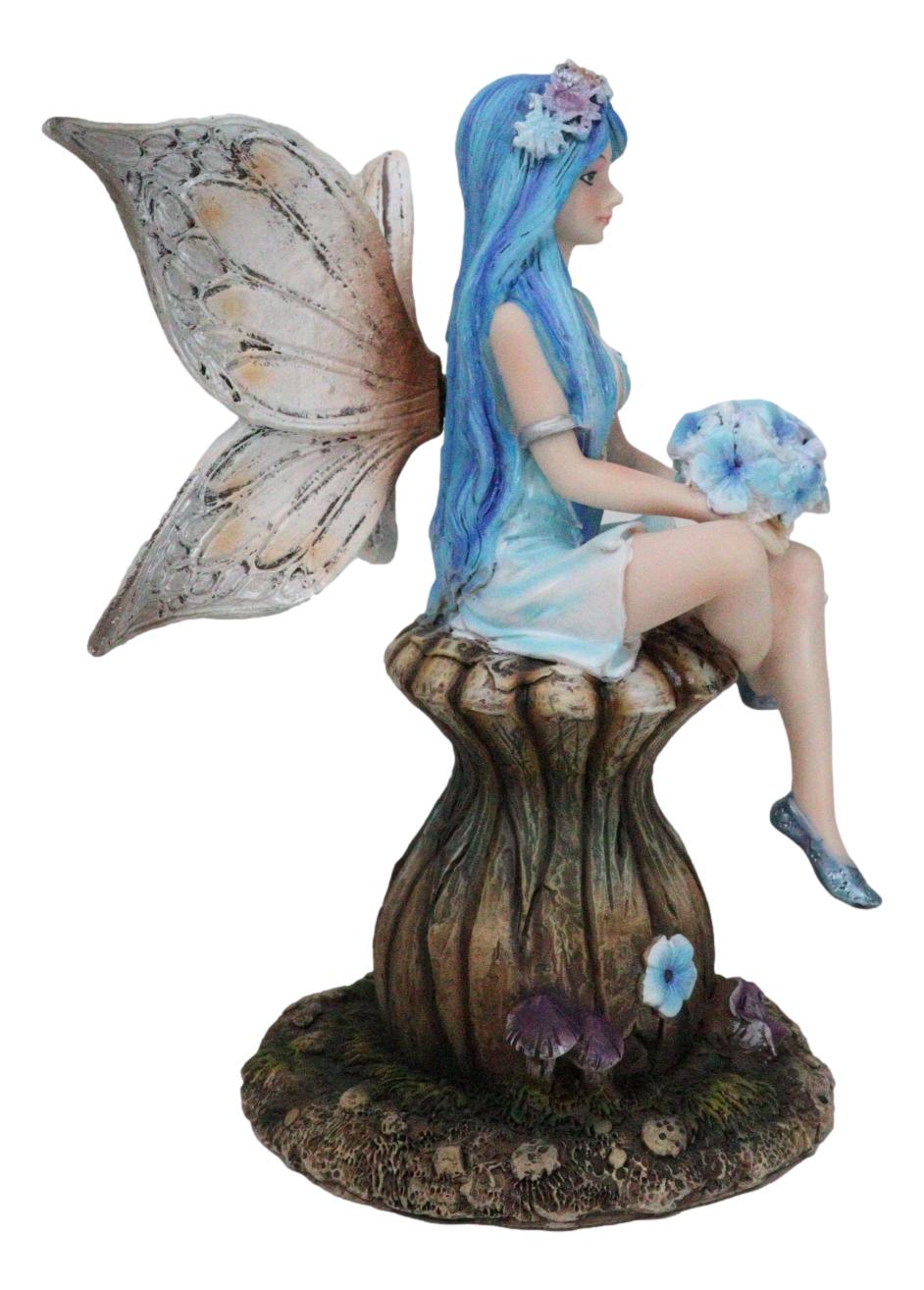 Blue Pansy Flower Fairy With Butterfly Wings Sitting On Mushroom Figurine 7"H