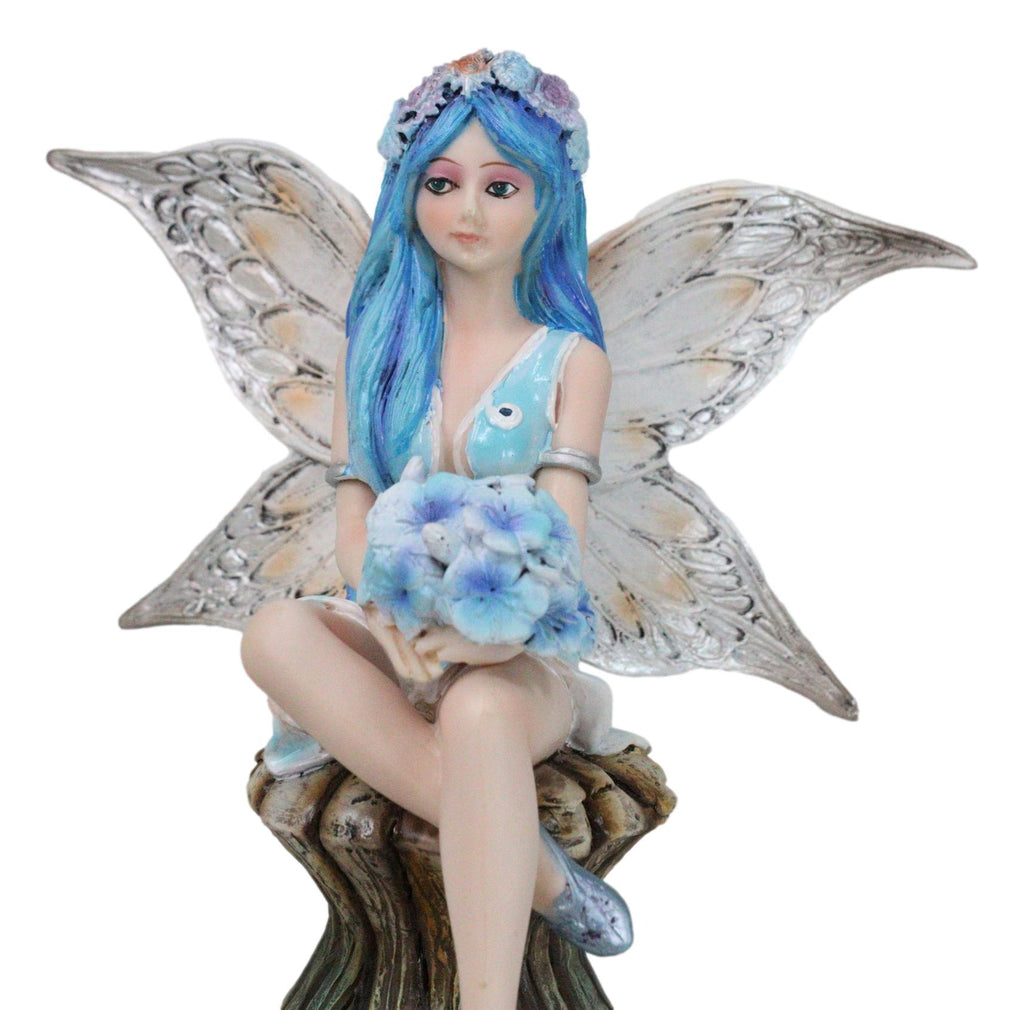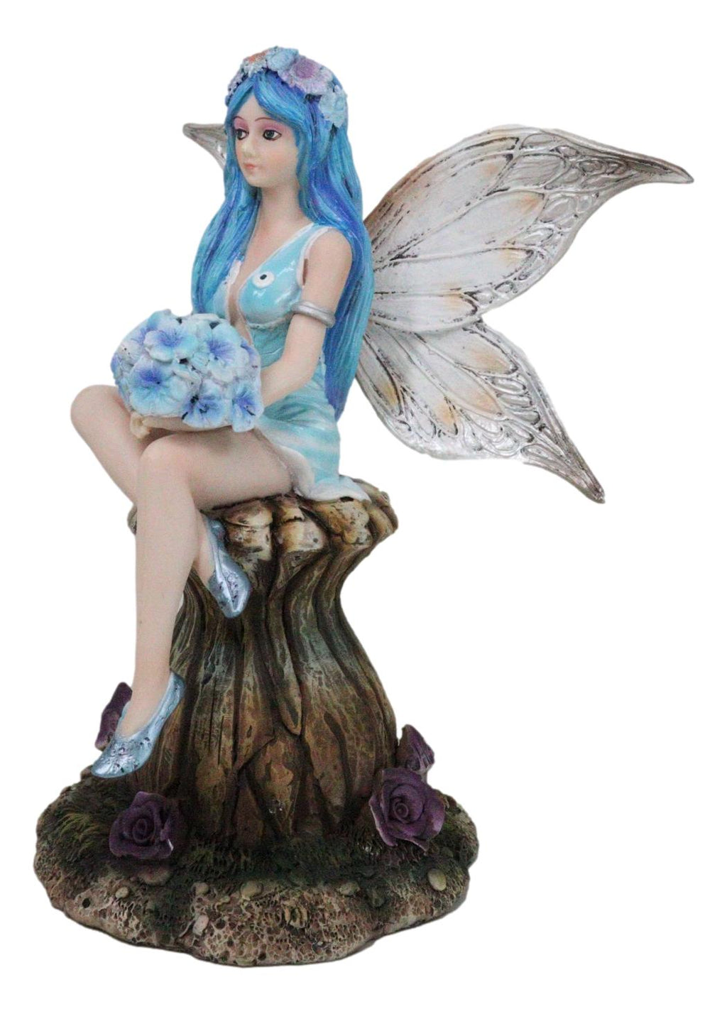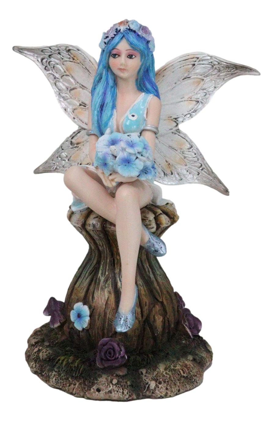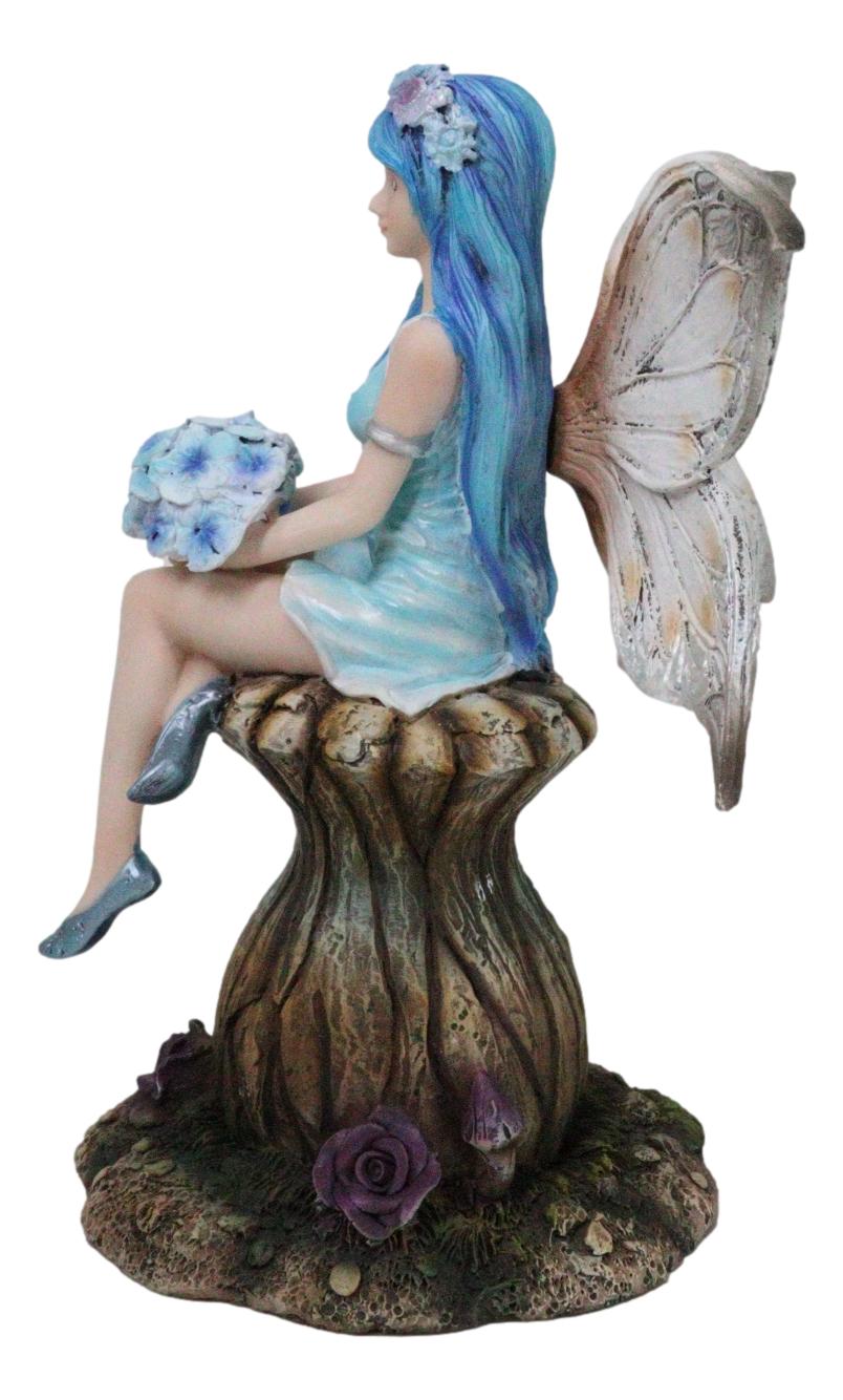Blue Pansy Flower Fairy With Butterfly Wings Sitting On Mushroom Figurine 7"H