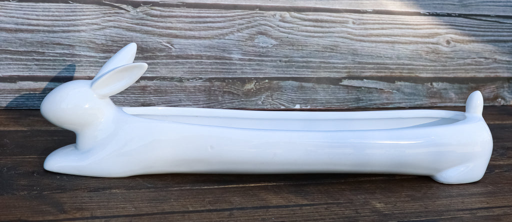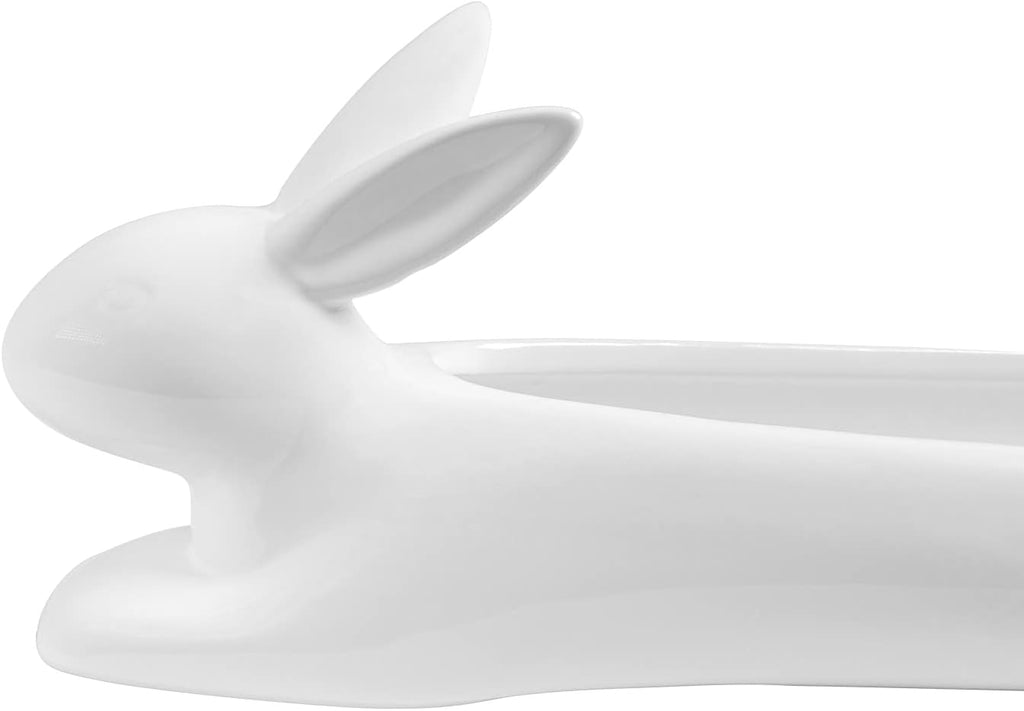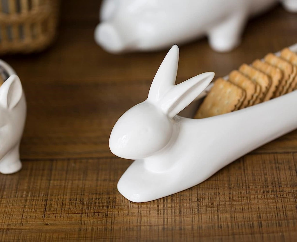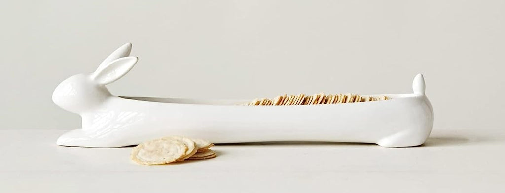 • Keep your crackers neat and organized the next time you serve them. This long white dish keeps them lined up in a row. Purchase multiples and have each dish contain a different type of cracker. • This Rabbit Cracker Dish measures 15.5" Long 4.25" High and 3.25" Deep approximately. It weighs about 2.75 pounds. • Our traditionally crafted pottery are made of the highest quality porcelain available and fired at a high temperature to maximize the strength of the porcelain, making them superior to other ceramics in the market. Our pottery are more resistant to cracks, stains, and scratches. Our porcelain is food safe and contains no lead or cadmium. • Props in photos are not included with the item. This listing is for 1 rabbit cracker dish.