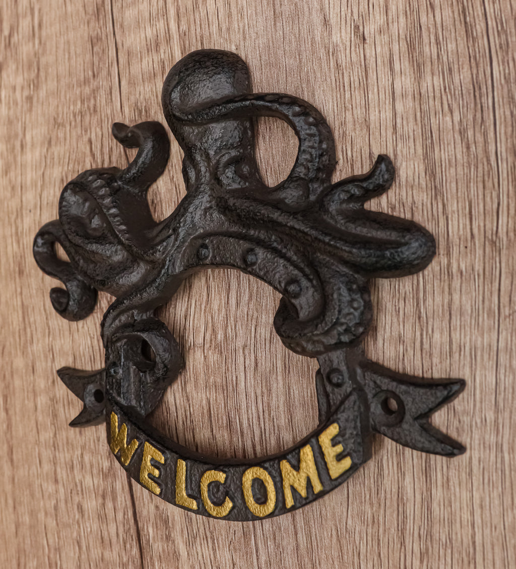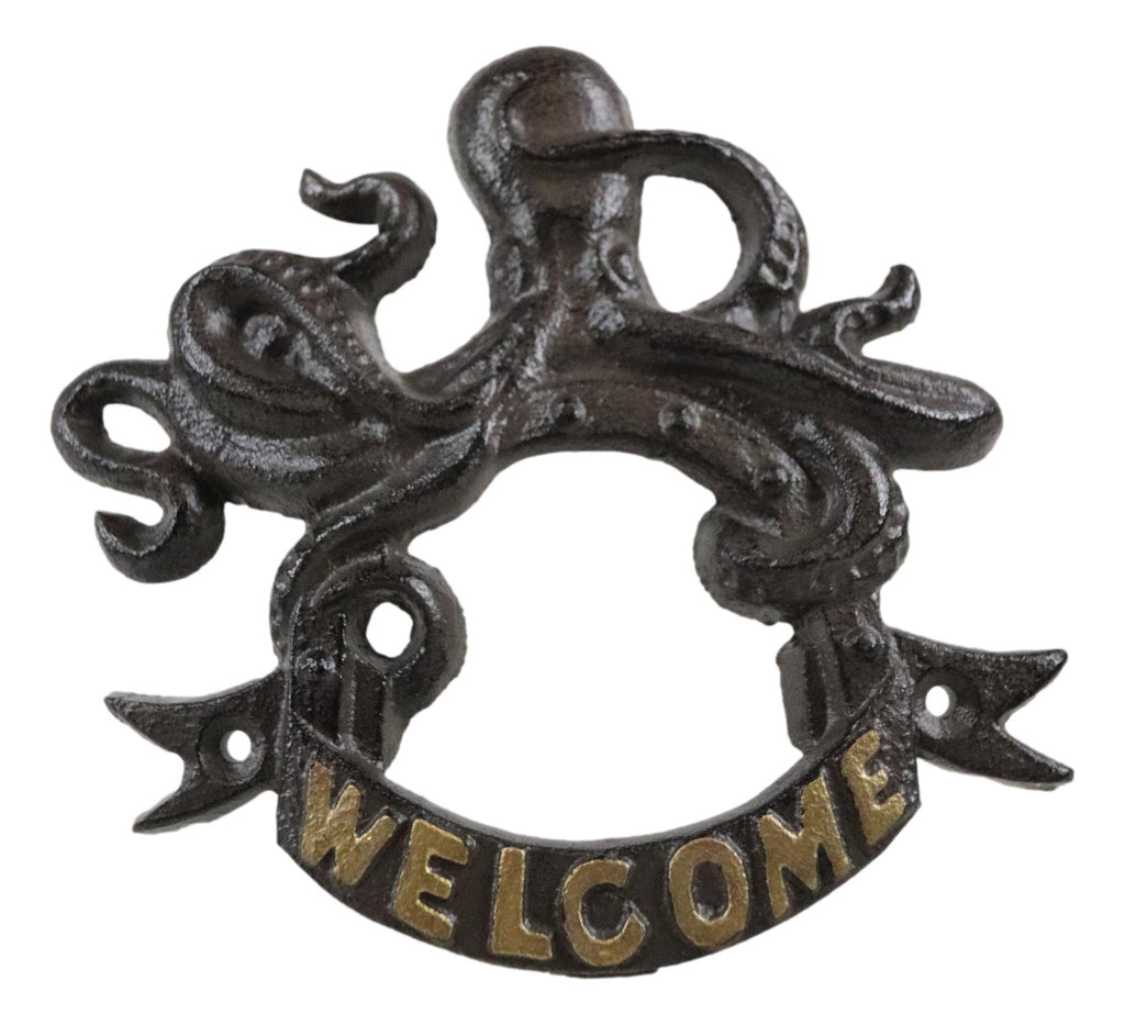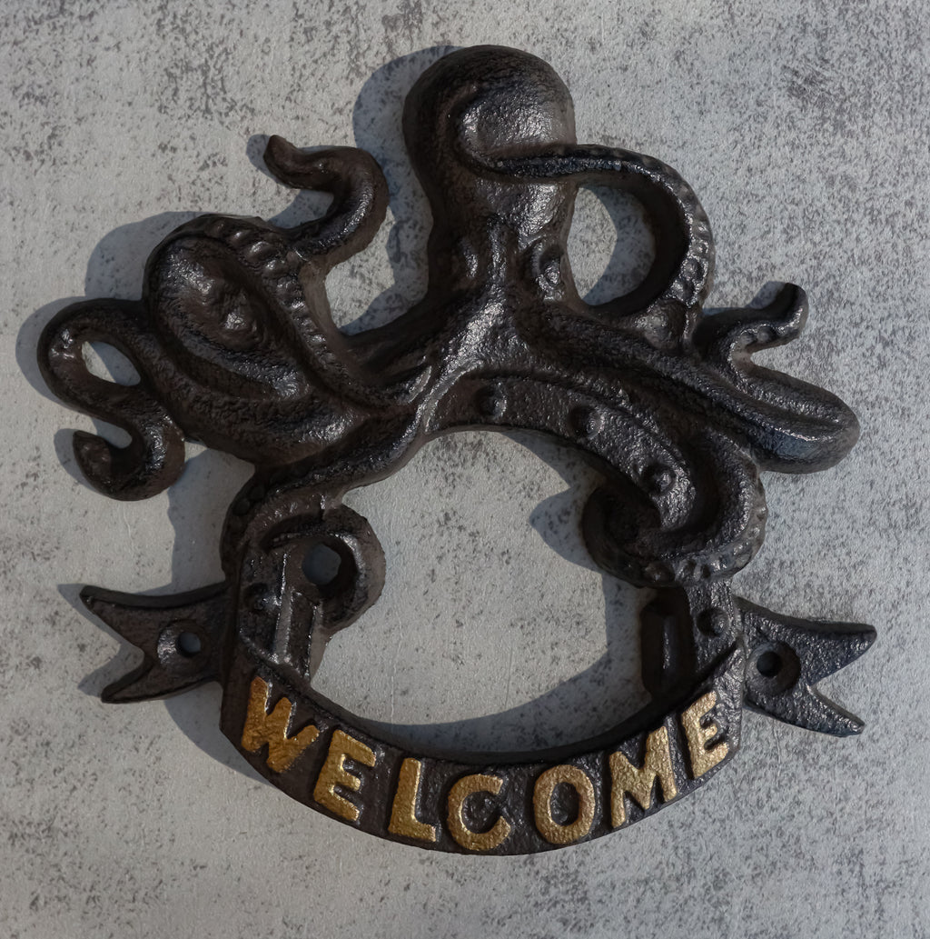 • Welcome guests to your coastal retreat with our captivating Cast Iron Octopus Wall Plaque. This enchanting piece adds a touch of maritime magic to any entryway or living space, showcasing the intricate design of an octopus with precision and style. Crafted from durable cast iron, it promises to greet visitors with a warm and enduring message for years to come. Whether you're by the sea or simply adore nautical aesthetics, this octopus welcome sign is the perfect addition to your decor.