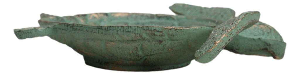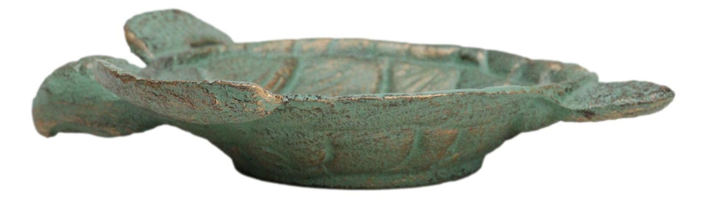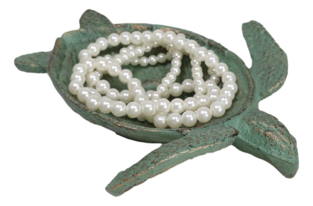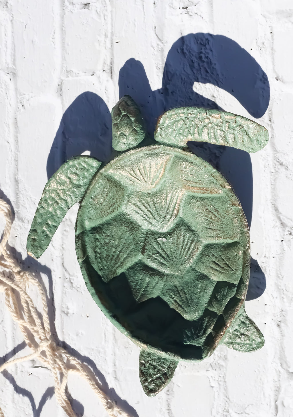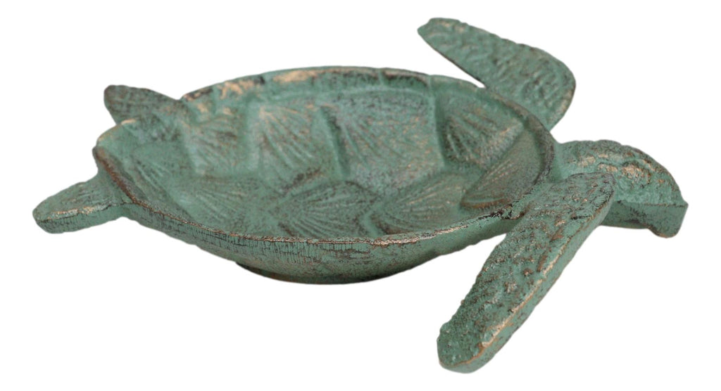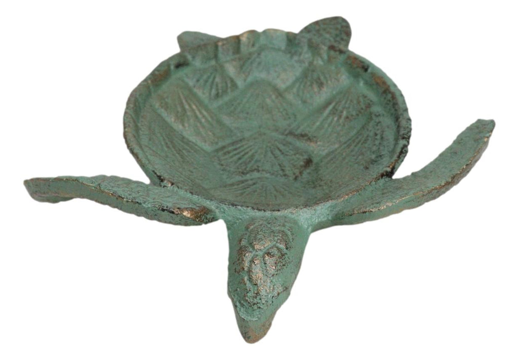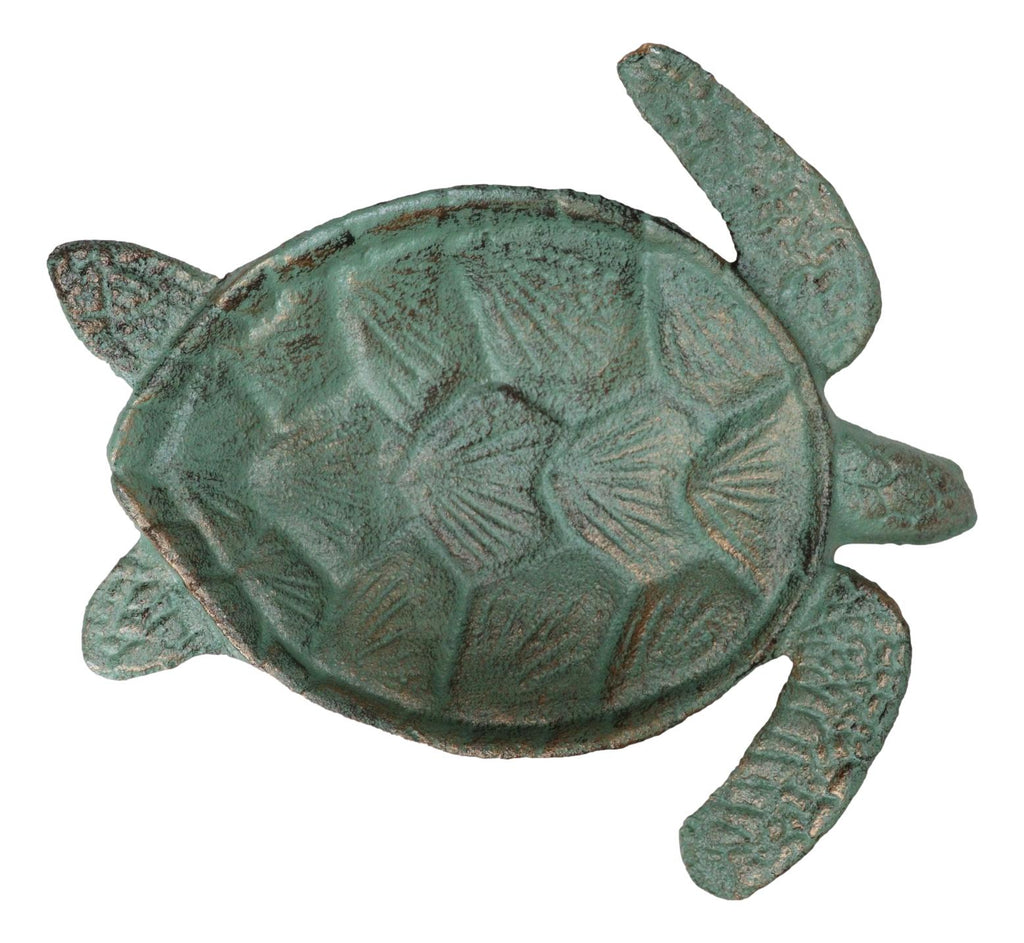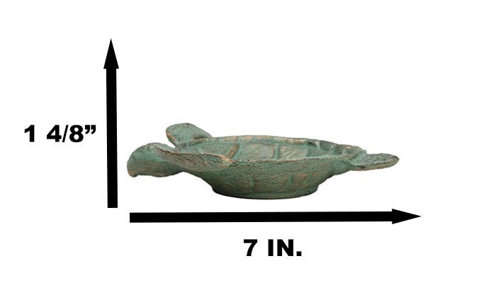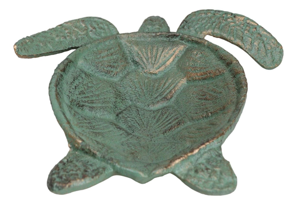 • This Whimsical Sea Turtle Tray Or Dish measures 1.5" High, 6" Long and 3.5" Wide approximately. It weighs about 1 pound. • This Whimsical Sea Turtle Tray Or Dish is made of rustic cast iron, hand crafted and painted individually to a verdi green finish. • Dive into coastal elegance with our Cast Iron Sea Turtle Dish Tray. This exquisite piece not only serves as a functional dish tray for your bar soap, coins, trinkets but also doubles as a stunning work of art that will add a touch of the ocean to your home decor. Crafted with durable cast iron, it features intricate detailing of a majestic sea turtle, bringing a sense of marine wonder into your space. • Props in photos are not included with the item.