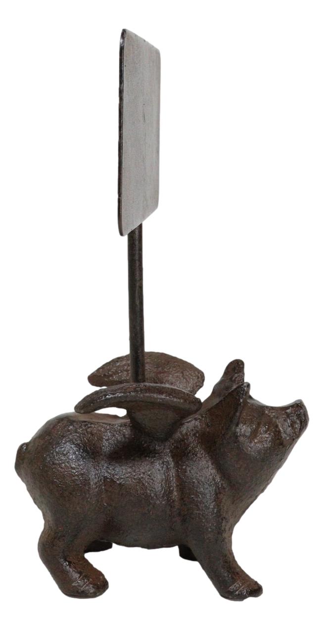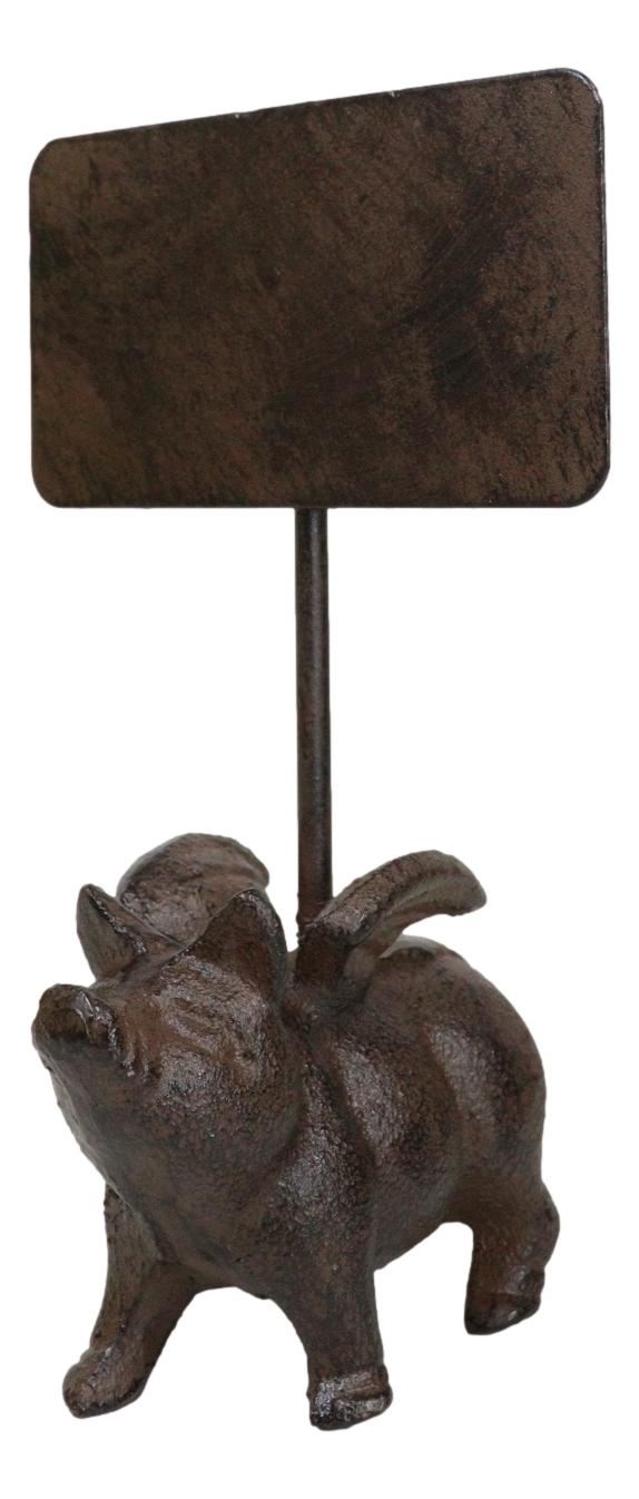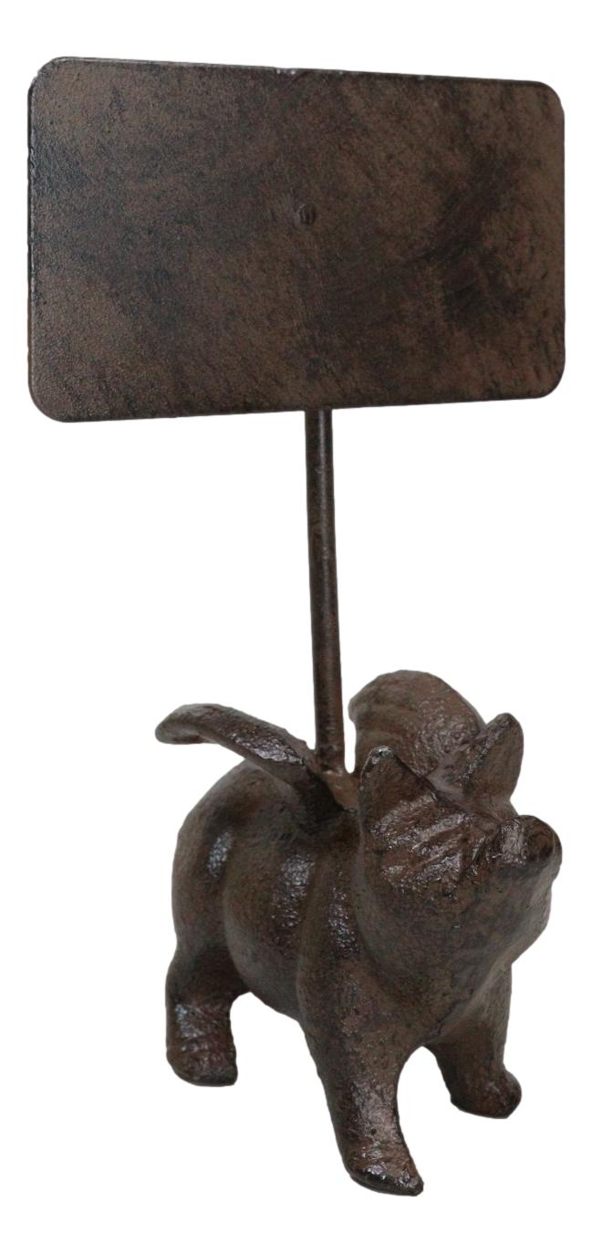 • This flying pig with chalkboard plank sign is made of cast iron, hand painted and polished in rust bronze finish.