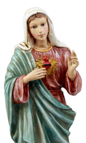 • This Sacred Heart Of Mary sculpture is designed to represent her joys, sorrows, virtues, obedience to God and maternal love for Jesus Christ. Our sculptors and painters work together to bring this beautiful statue to form in 3D on resin medium.