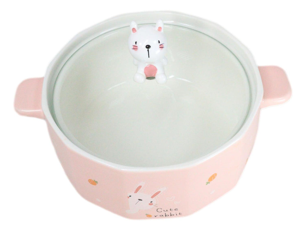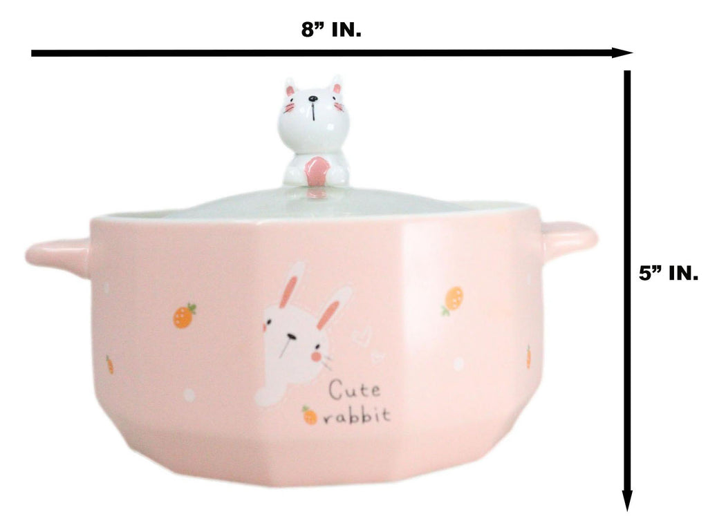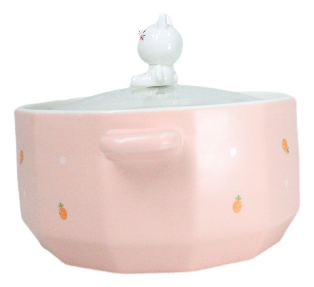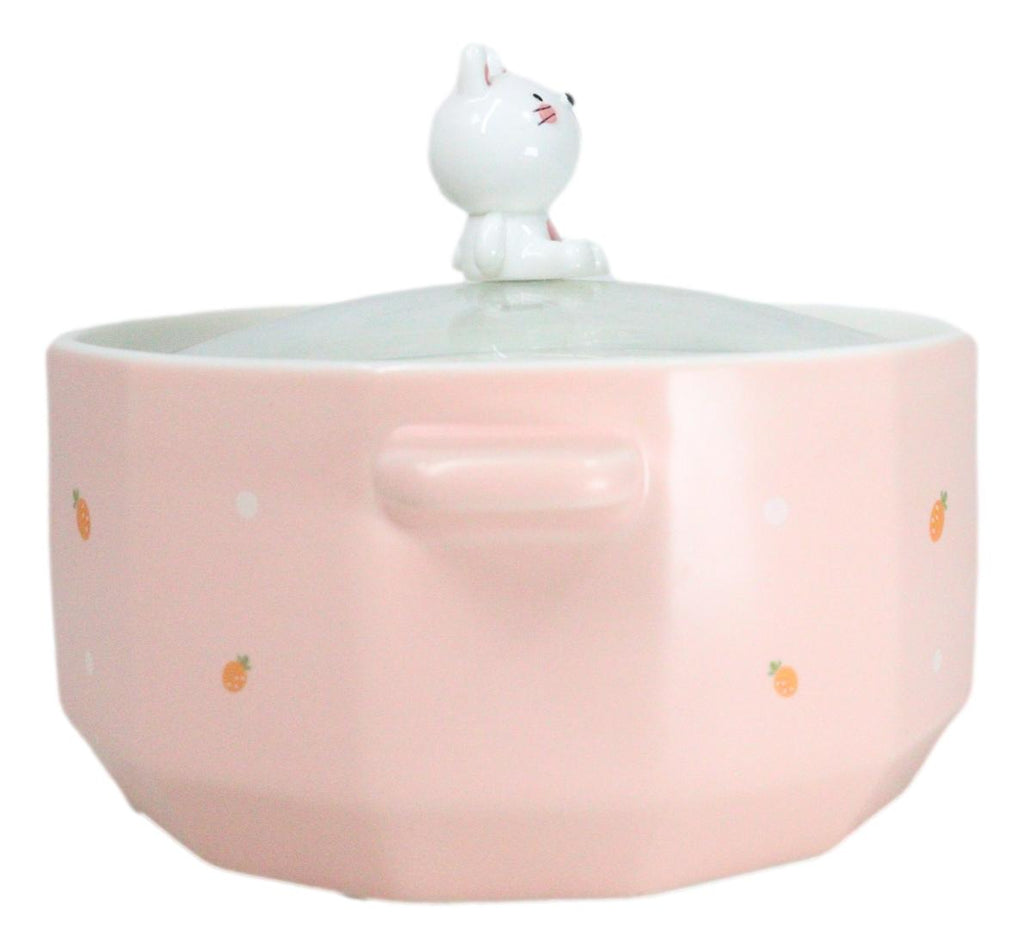 Ceramic Pink Rabbit With Carrots 30oz Noodle Dessert Food Bowl W/ Glass Lid