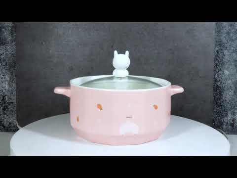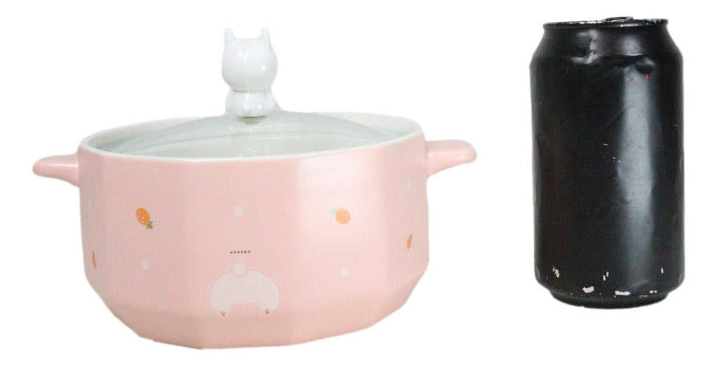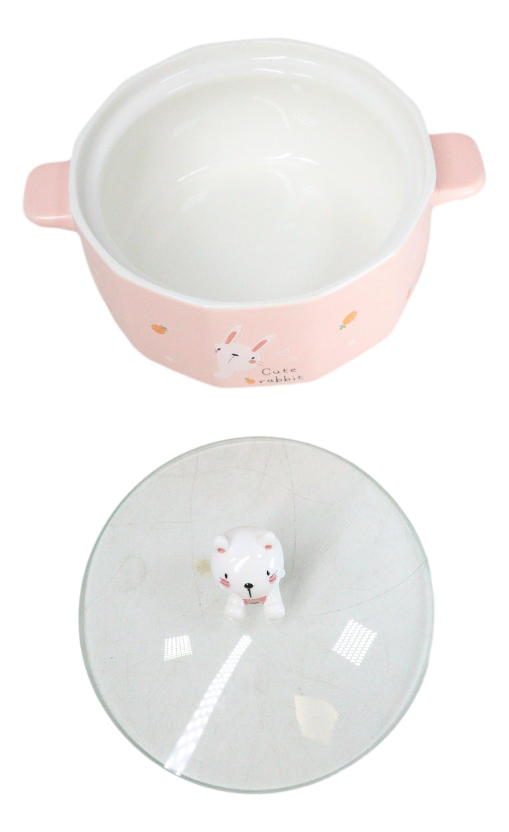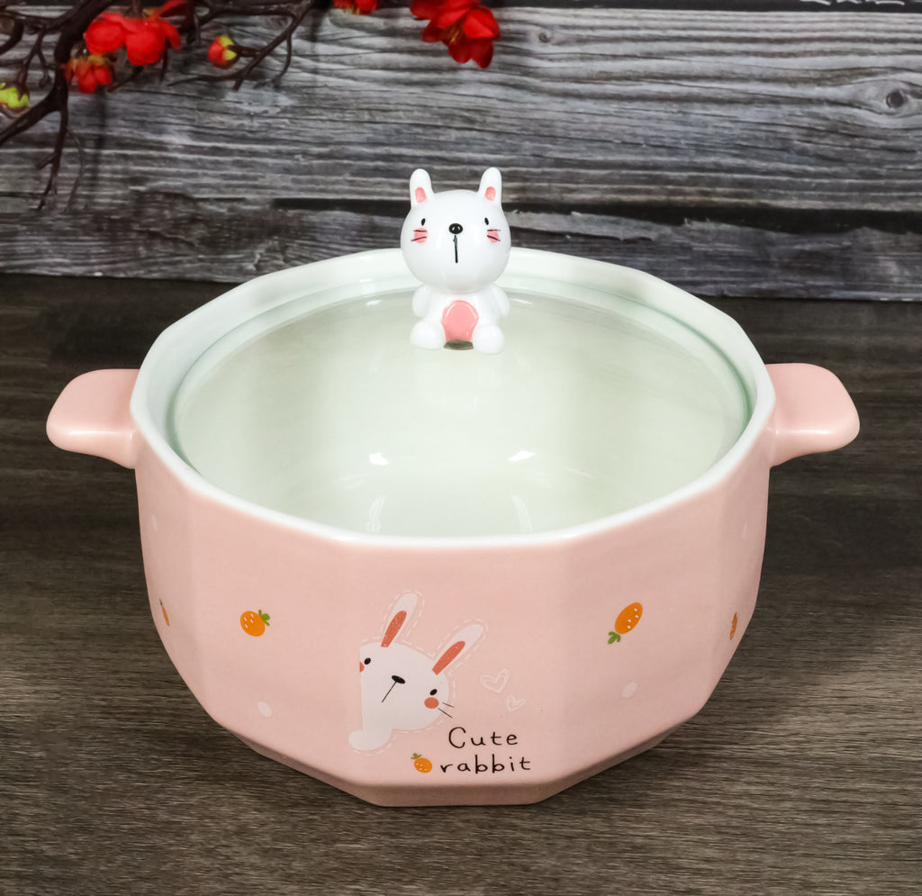 Ceramic Pink Rabbit With Carrots 30oz Noodle Dessert Food Bowl W/ Glass Lid