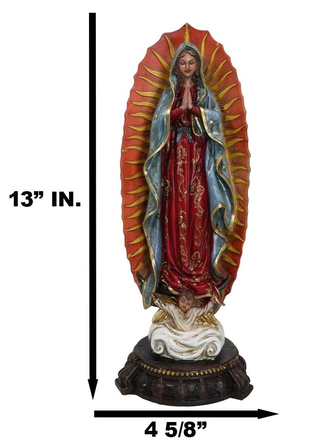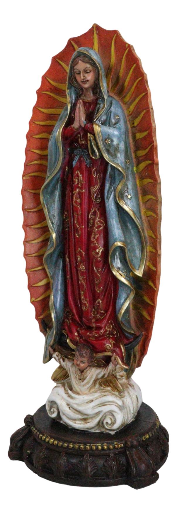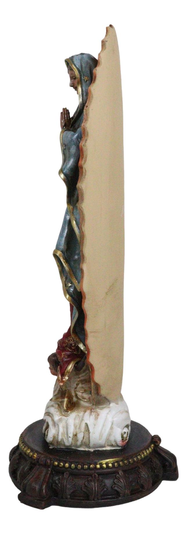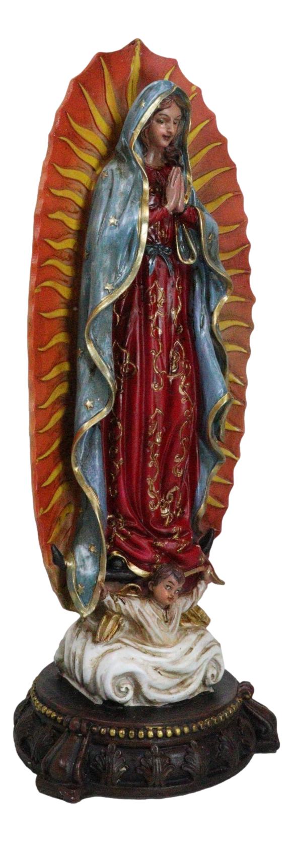 • This Our Lady of Guadalupe Statue measures 13" tall, 4.5" long and 4.5" deep approximately. It weighs about 2 pounds. • This Our Lady of Guadalupe Statue is made of designer composite resin, hand painted and polished individually. Color tone may vary slightly from photos. • Our Lady of Guadalupe appeared to Juan Diego to offer the people of Mexico faith, hope, and consolation. In this elegant statue, the Virgin Mother is portrayed in the classic image of our Lady of Guadalupe where she stands upon the moon, wearing a robe of stars and garments of royal colors. • Props in photos are not included with the item.